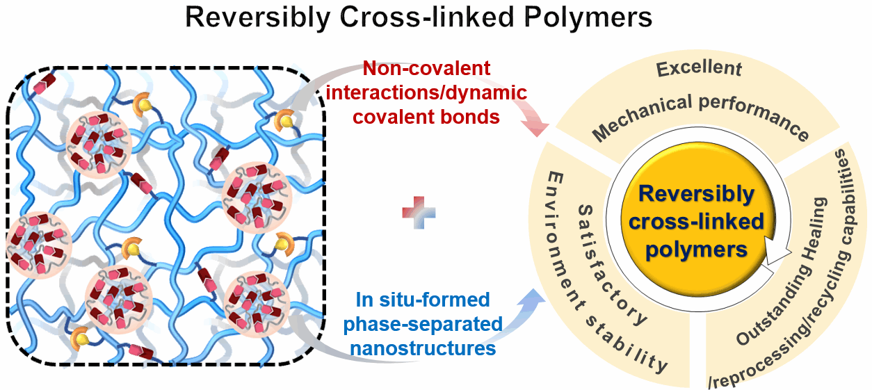 聚合物材料因其卓越的力学性能与稳定性,已成为现代社会和经济发展的基础材料。然而,传统聚合物难以实现高效回收与循环利用,导致严重的资源浪费与环境负担。为应对这一挑战,研究者基于非共价键与动态共价键的可逆交联策略,先后发展了超分子聚合物、共价自适应网络(CANs)、类玻璃聚合物(vitrimers),使材料具备修复、可重复加工及可化学解聚回收等特性。随着应用场景不断拓展,人们对可持续聚合物提出了更高要求:可持续聚合物材料在保持动态特性的同时,还必须展现出良好的环境稳定性,以及与传统聚合物相当甚至超越传统聚合物的力学性能。然而,构筑兼具高性能与可持续性的聚合物材料仍面临巨大的挑战。