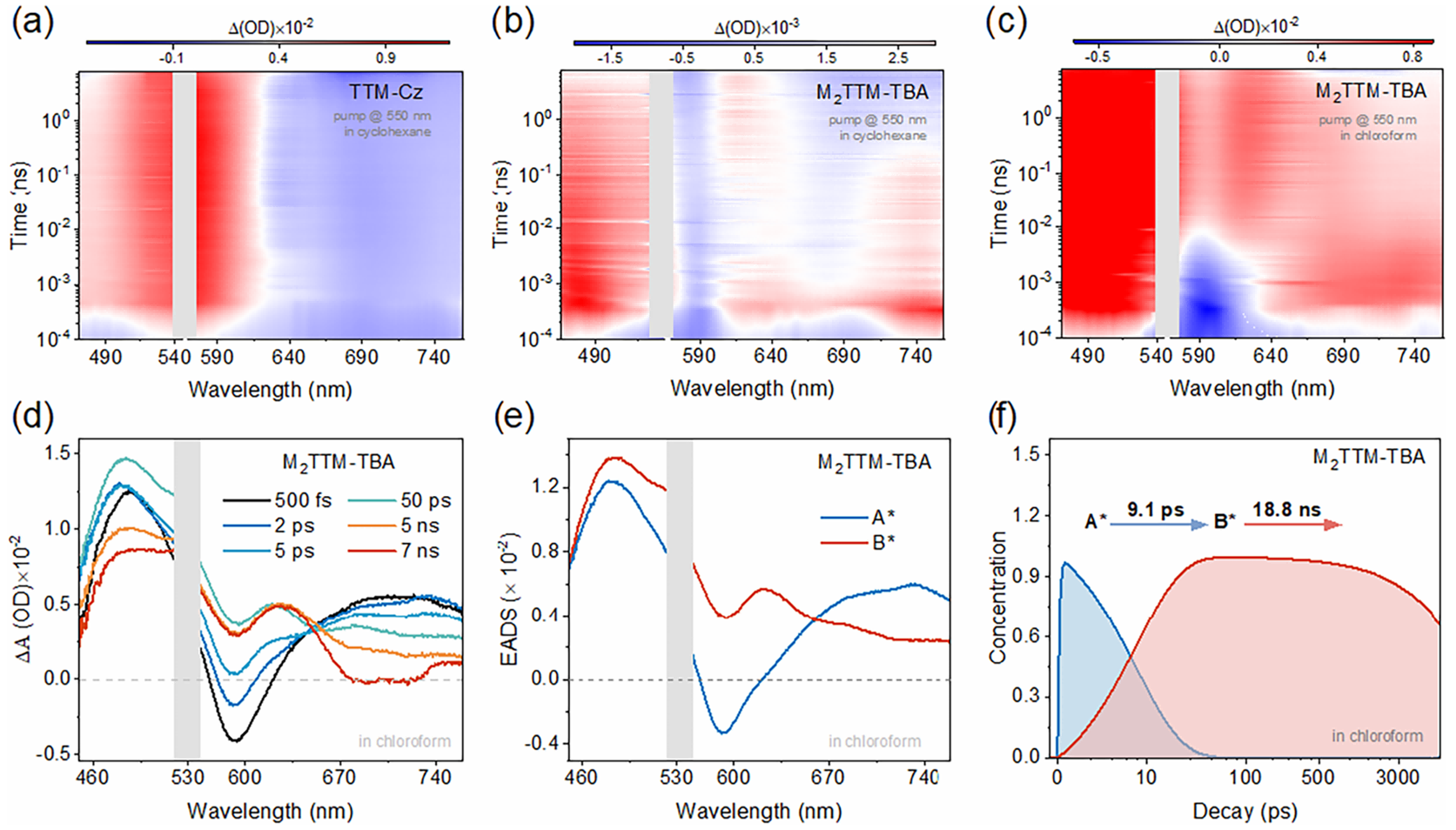 图4.a)TTM-Cz和b)M2TTM-TBA在环己烷中以及c)M2TTM-TBA在三氯甲烷中的三维飞秒瞬态吸收光谱;M2TTM-TBA在三氯甲烷中d)不同时间尺度下的二维飞秒吸收光谱、e)激发态演化相关差谱和f)EADSA*到EADS B*的演化过程。