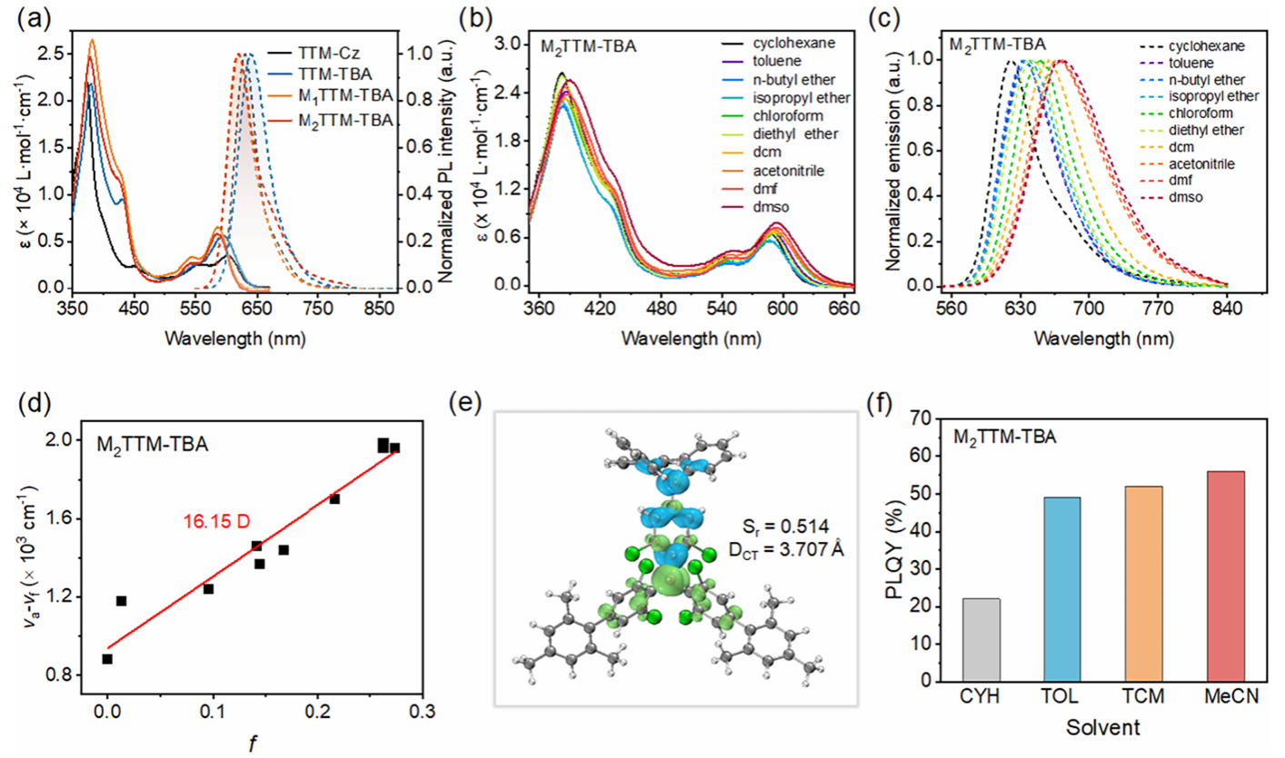 所有TBA修饰的TTM自由基的紫外-可见吸收光谱均显示,其第一激发态的摩尔吸光系数明显增强,表明反芳香性缓解效应可有效提升D1态的电子耦合(Hab)。有趣的是,M1TTM-TBA和M2TTM-TBA自由基在极性溶剂(如乙腈和二甲基亚砜)中仍然发光。此外,它们的光致发光量子产率(PLQYs)随着溶剂极性的增加而提高,这一趋势与之前报道的D-A•型发光TTM类自由基明显不同。