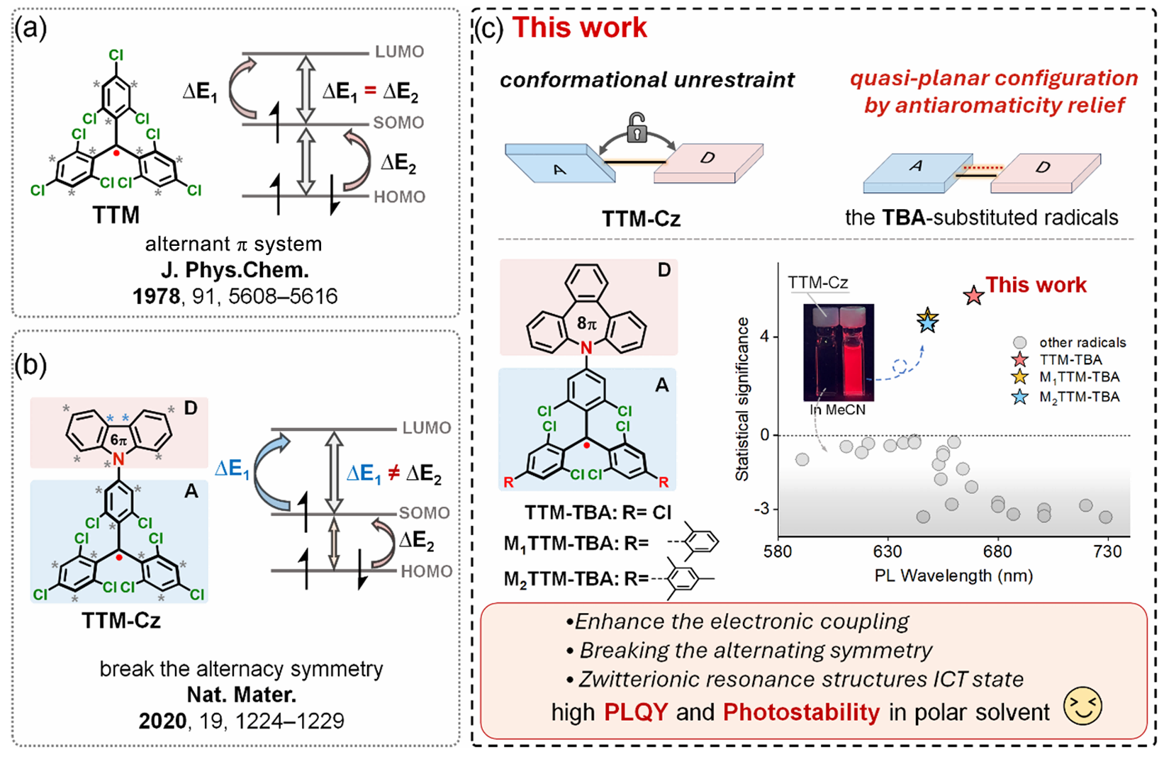 空气稳定的三(2,4,6-三氯苯基)甲基自由基(TTM)衍生物具有独特的双线态(doublet)发光性质,近年来已成为光子学与光电子学领域备受关注的发光材料体系。然而,传统的三苯甲基自由基(TTM)因分子的交替对称性,导致其D0-D1跃迁振子强度接近于零,第一激发态的摩尔吸光系数很小(在103量级),发光效率和光稳定性因此受限。为了克服该问题,李峰课题组于2020年提出了通过打破交替对称性的分子设计策略,将原本跃迁禁阻的第一激发态(D1)转化为电荷转移(CT)态——具体表现为电子从给体的最高占据分子轨道(HOMO)到TTM基团的单电子未占据分子轨道(SUMO)的跃迁。相较于局域激发态,该CT激发态有效提升了TTM类自由基的发光效率。然而,给体-受体(D-A•)型TTM类自由基通常对溶剂极性敏感,在极性环境中往往面临光稳定性下降和荧光效率降低等问题,这对其在电致发光、生物成像等领域的应用构成了关键挑战——亟需建立新的分子设计原则,以实现自由基发光材料在不同极性环境中兼具高稳定性和高效率的发光性能。