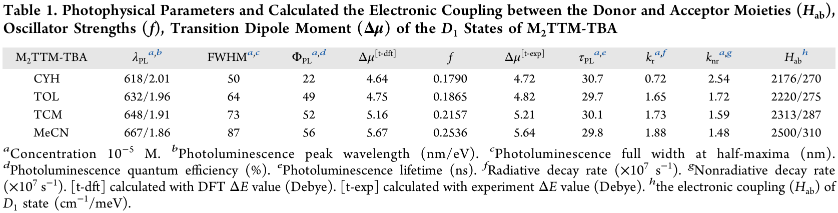 表1. M2TTM-TBA的稳态光物理数据以及D-A•之间电子耦合计算结果汇总。