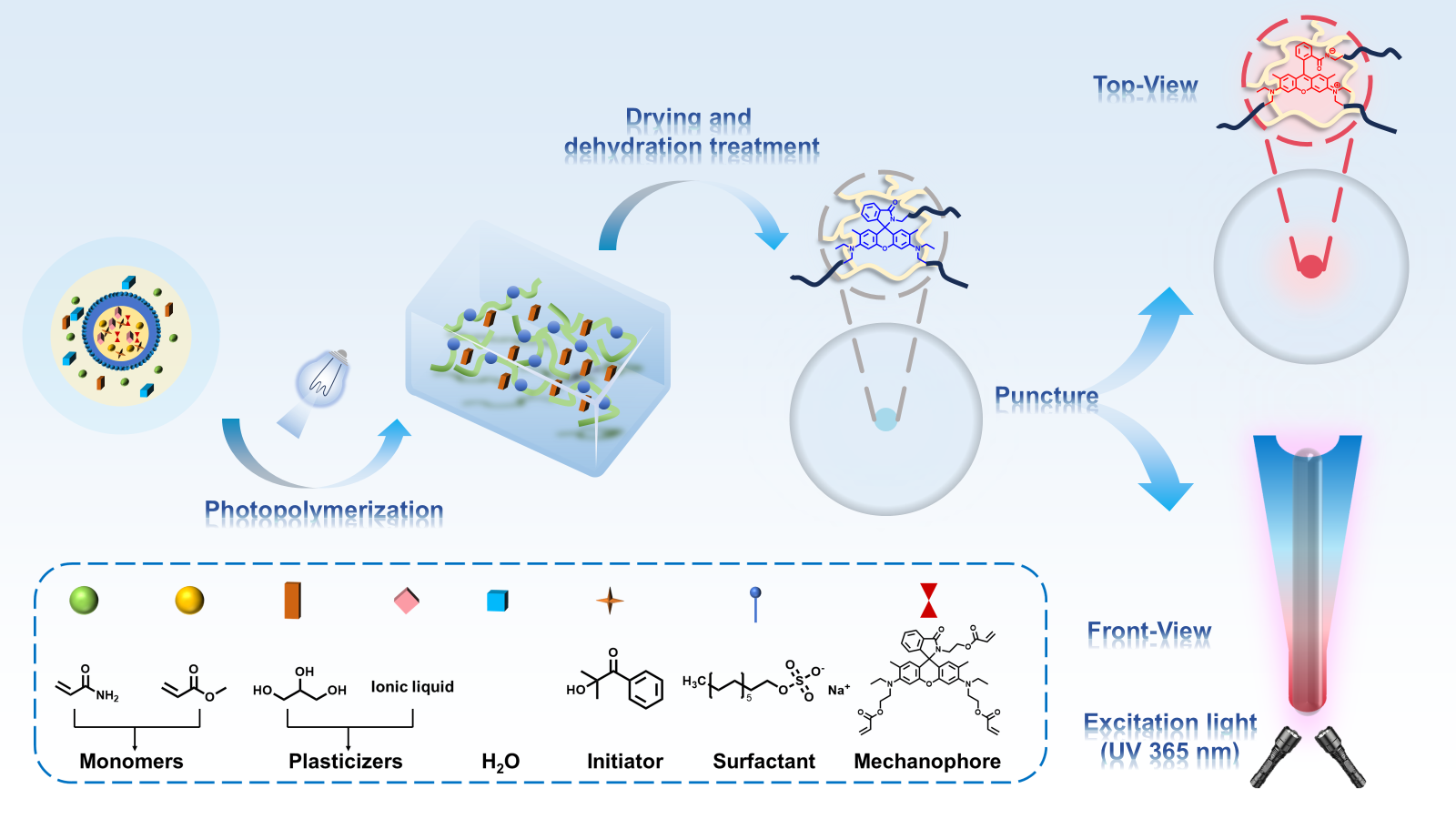 图1.抗穿刺离子液体凝胶的制备过程与穿刺应力实时可视化示意图