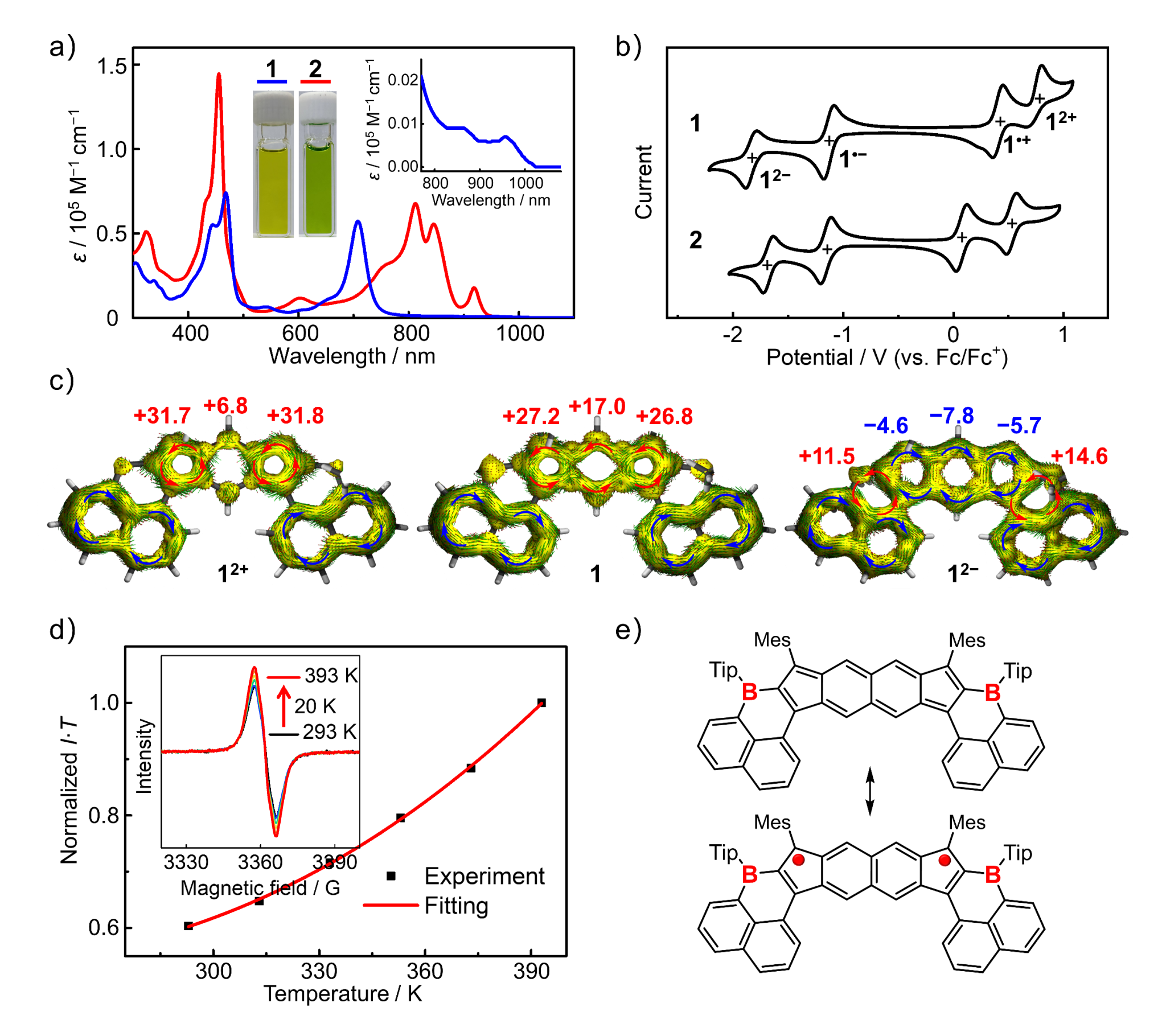 图2.硼环扩展环烃的(a)吸收光谱和(b)循环伏安曲线;(c)1和二价离子态的ACID图和NICS(1)ZZ值;2的(d)变温电子顺磁共振谱和(e)闭壳/开壳共振结构。