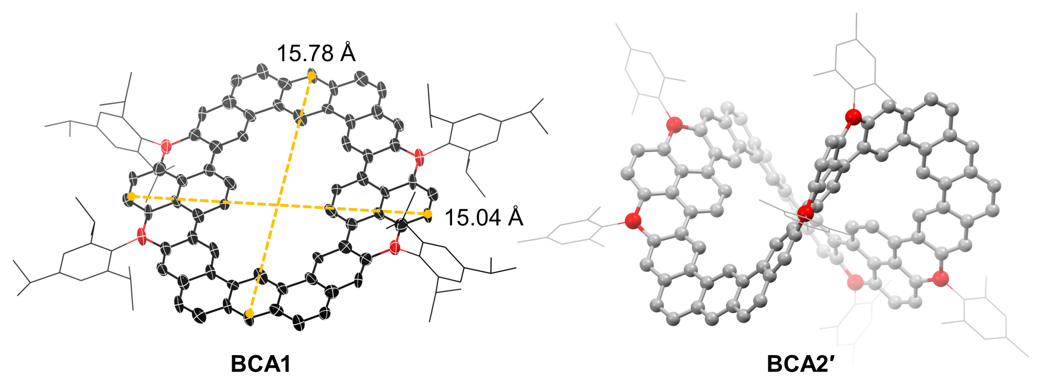 窦传冬教授课题组提出并实现了分子环带的硼原子掺杂(图1),通过设计新型硼烷单元、优化大环合成策略,构造出两例纯硼掺杂的分子环带(BCA1和BCA2),进而揭示了硼原子赋予分子环带的独特物化性质,包括低LUMO能级结构、宽光谱吸收和红色荧光性质、以及长程独立还原反应过程和二价阴离子的强开壳双自由基特征。这类分子代表了首例硼杂环带分子碳,成为含硼分子碳家族的新类型成员(Angew. Chem. Int. Ed. 2026, DOI: 10.1002/anie.8330393,VIPpaper)。