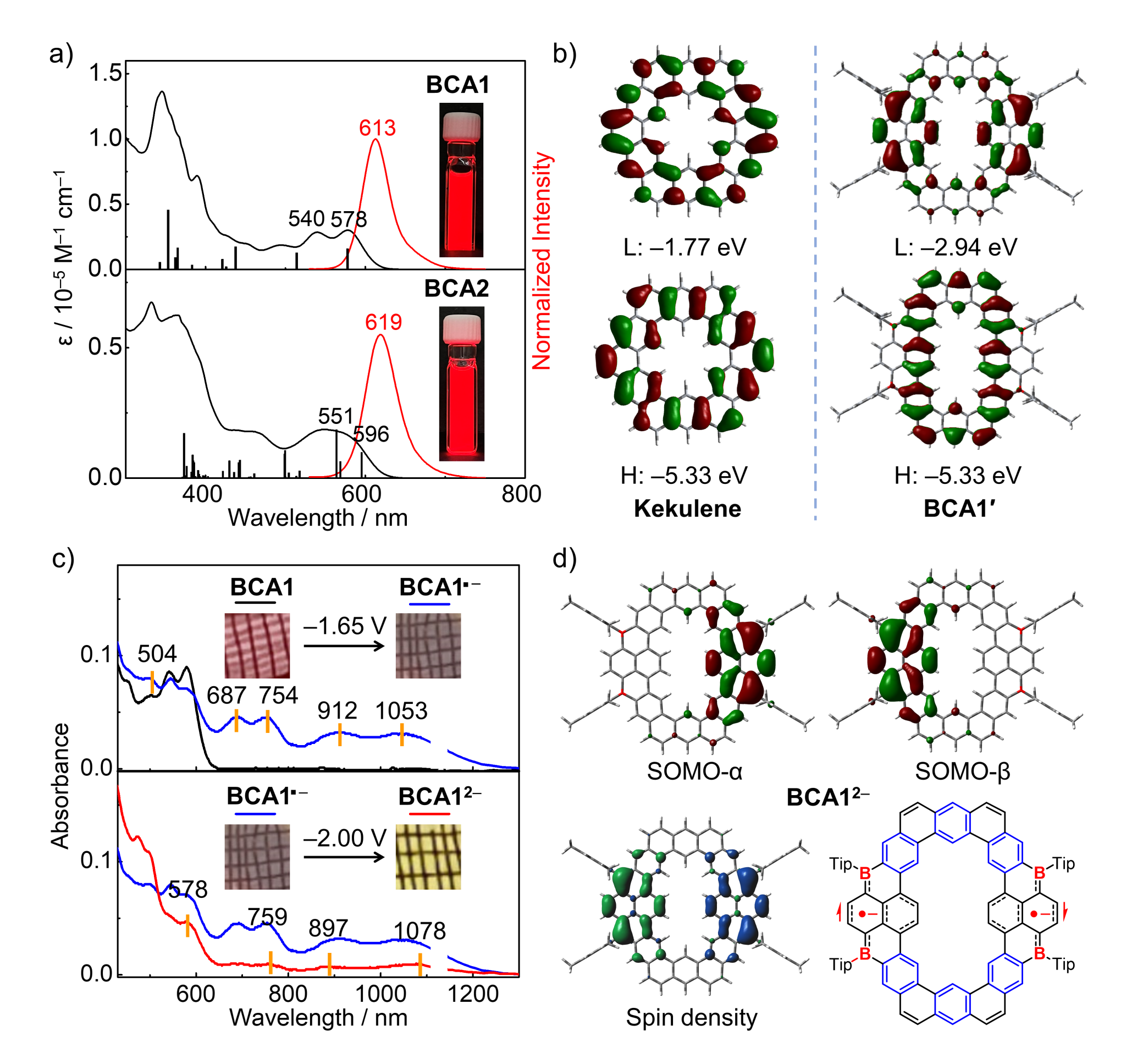 图3.硼杂环带分子碳的a) 吸收/荧光光谱与b)BCA1的分子轨道能级图;c)BCA1原位电化学还原光谱;d)BCA1′2−的前线轨道、自旋密度、分子结构
