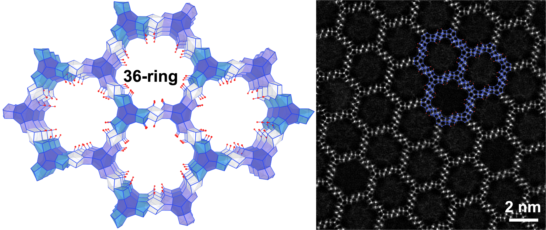 图1.JU-69的36元环孔道示意图及其基于4D-STEM数据重构的电子叠层衍射图像