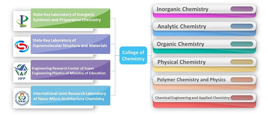 The College of Chemistry at Jilin University is one of the leading chemistry education and research centers in China. Its precedent, the Department of Chemistry, was founded in 1952 as a result of the nation-wide college and department adjustment. Now, the College of Chemistry is comprised of 6 departments, including Inorganic Chemistry, Analytical Chemistry, Organic Chemistry, Physical Chemistry, Polymer Chemistry and Physics, and Chemical Engineering and Applied Chemistry, and 4 research institutes, including State Key Laboratory of Inorganic Synthesis and Preparative Chemistry, State Key Laboratory of Supramolecular Structure and Materials, International Joint Research Laboratory of Nano-Micro Architecture Chemistry, and National and Local Joint Engineering Laboratory for Synthesis Technology of High Performance Polymer.