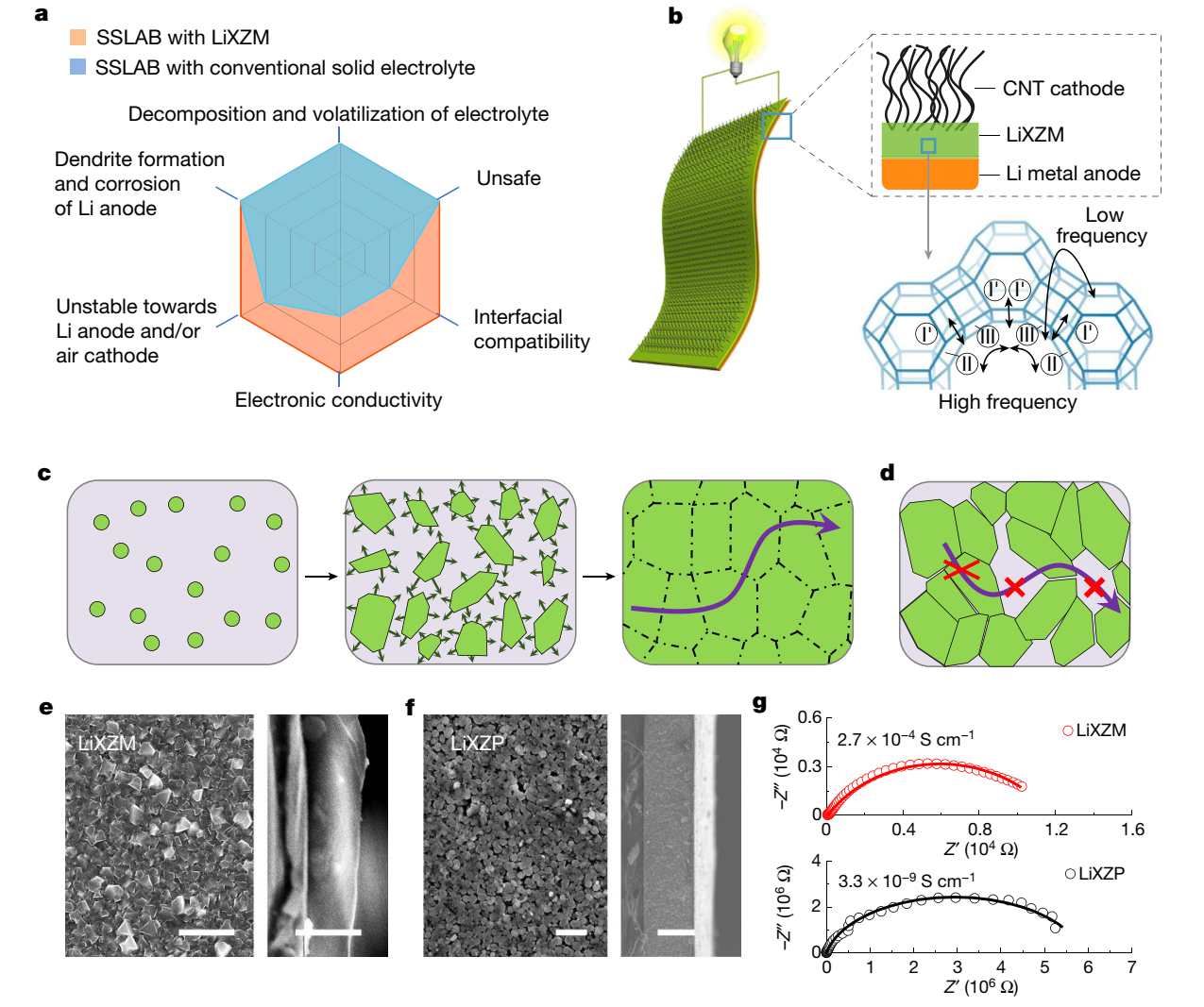 Solid-state lithium (Li)–air batteries are recognized as a next-generation solution for energy storage to address the safety and electrochemical stability issues that are encountered in liquid battery systems. However, conventional solid electrolytes are unsuitable for use in solid-state Li–air systems owing to their instability towards lithium metal and/or air, as well as the difficulty in constructing low-resistance interfaces5. Here we present an integrated solid-state Li–air battery that contains an ultrathin, high-ion-conductive lithium-ion-exchanged zeolite X (LiX) membrane as the sole solid electrolyte. This electrolyte is integrated with cast lithium as the anode and carbon nanotubes as the cathode using an in situ assembly strategy. Owing to the intrinsic chemical stability of the zeolite, degeneration of the electrolyte from the effects of lithium or air is effectively suppressed. The battery has a capacity of 12,020 milliamp hours per gram of carbon nanotubes, and has a cycle life of 149 cycles at a current density of 500 milliamps per gram and at a capacity of 1,000 milliamp hours per gram. This cycle life is greater than those of batteries based on lithium aluminium germanium phosphate (12 cycles) and organic electrolytes (102 cycles) under the same conditions. The electrochemical performance, flexibility and stability of zeolite-based Li–air batteries confer practical applicability that could extend to other energy-storage systems, such as Li–ion, Na–air and Na–ion batteries.