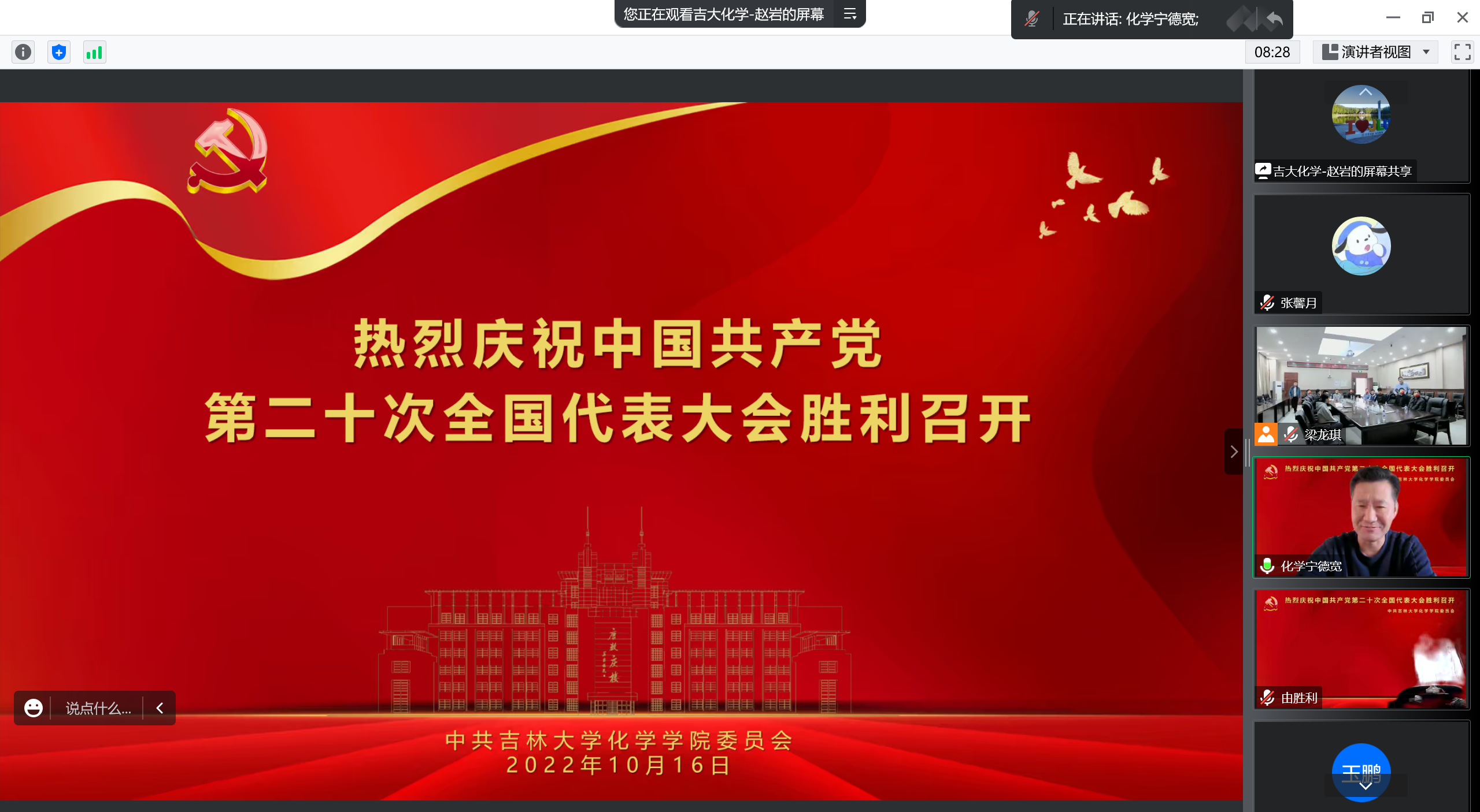 党委书记宁德宽、院长吕中元、党政领导班子成员、两委委员、教工支部书记在线上主会场集中收看,学院驻校教师和学生党员代表在唐敖庆楼A308会议室设立线下分会场。