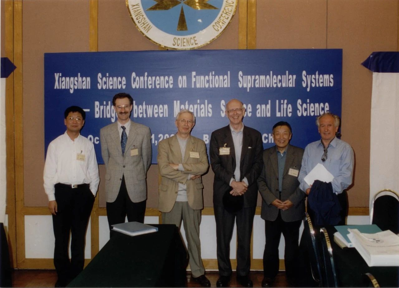 图4 2001年功能超分子体系香山科学会议。(从左至右依次为:张希,Andre Laschewsky,Jean-Marie Lehn,George. M. Whitesides,沈家骢,Helmut Ringsdorf)
