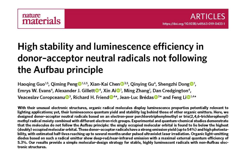 超分子结构与材料国家重点实验室李峰教授团队、佐治亚理工学院Jean-Luc Brédas教授团队和剑桥大学卡文迪许实验室Richard H. Friend教授团队的合作研究论文“不遵循构造原理的高稳定高发光效率给受体结构中性自由基”(High stability and luminescence efficiency in donor–acceptor neutral radicals not following the Aufbau principle, Nature Materials, 2019, DOI:10.1038/s41563-019-0433-1),哔咔漫画