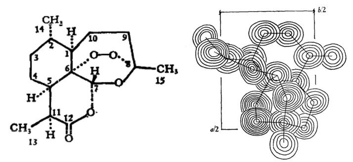 图1.青蒿素的分子结构及其晶体结构三维电子密度叠合圈,摘自发表在《科学通报》的原始论文。4