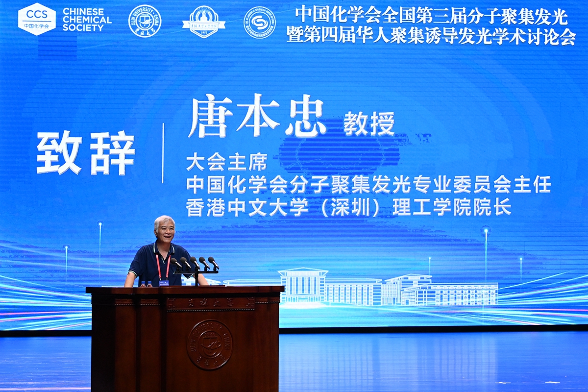 及各协办单位为会议成功举办给予的支持表示衷心感谢,并简要介绍了中国化学会分子聚集发光专委会和华人聚集诱导发光学术讨论会的发展历程。他表示,本次会议以“分子聚集发光:突破、超越和挑战”为主题,充分展示近年来分子聚集发光相关研究领域涌现出的新方向、新进展、新边界,必将进一步为聚集诱导发光在新时期的大发展注入强劲动力。希望与会专家学者和同学们在本次会议中广泛交流、深入探讨,加强聚集诱导发光与各相关学科的交叉融合,产生新的增长点,促进分子聚集发光研究领域的创新发展。唐本忠同时分享了旗舰期刊《Aggregate》(《聚集体》)取得的办刊进展,并呼吁青年学者深入思考科学本质,深刻探究“何为好的科学”。