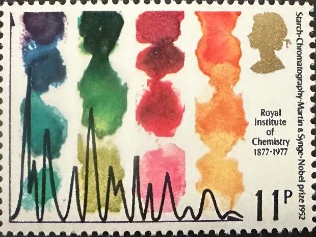 图2.英国于1977年发行的纪念邮票,呈现了Martin和Synge的色谱实验结果。