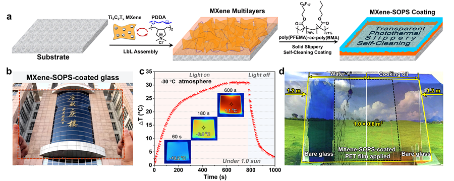 刘小孔教授研究团队设计并制备了一种高度透明的太阳光热抗/除冰涂层,该涂层对可见光的透明度高达77%,同时兼具自清洁、自修复、大面积制备等优异特性。这种涂层由超薄MXene多层膜与固态超滑自清洁表面(solid slippery self-cleaning surface)的结合构筑而成(图a,b)。得益于超薄MXene多层膜优异的光热转换性能,即使在环境温度为零下30 ℃的情况下,这种透明涂层在一个太阳光强照射下,也能够将表面温度提高31 ℃,有效阻止水的结冰或将先前形成的冰进行融化(图c)。同时,涂层的固态超滑表面赋予了其极佳的自清洁性能,能够有效抵抗水性及油性污渍(图d),可使没有冻结的水或融化的冰快速滑落而不留痕,实现太阳光照下高效抗冰或除冰的性能。该涂层具有在光照下实现自修复的性能,可以对抗物理损伤和化学氧化,降低维护成本并且延长使用寿命。这一具有高透明度与自清洁性能的太阳光热抗/除冰涂层有望在汽车挡风玻璃、建筑物玻璃幕墙、风力发电轮、太阳能发电板、飞机涂层等领域得到广泛应用。