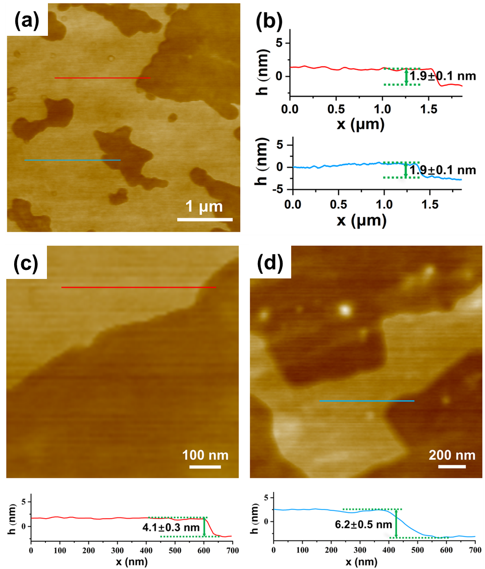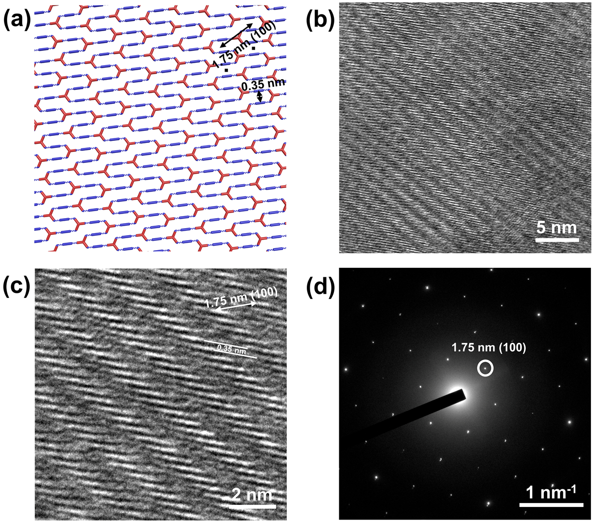 董泽元教授团队将柔性烷基链修饰的螺旋骨架应用到二维高分子的设计合成中,发现了首例“软”二维COF(图1)。通过高分辨透射电子显微镜(TEM)(图2),可以观察到“软”二维COF具有紧实的蜂巢拓扑结构,这一独特结构是由螺旋骨架在二维空间上通过π-π相互作用发生分子内自堆积而形成的。同时,这类“软”COFs具有弱的层间非共价作用力,在溶液中能够分散成单层二维拓扑结构。利用原子力显微镜(AFM)可以验证其单层、双层、三层等寡层结构(图3)。而且,这类“软”二维COF材料具有结构本身的二维手性,并展现出对称性破缺的性质。