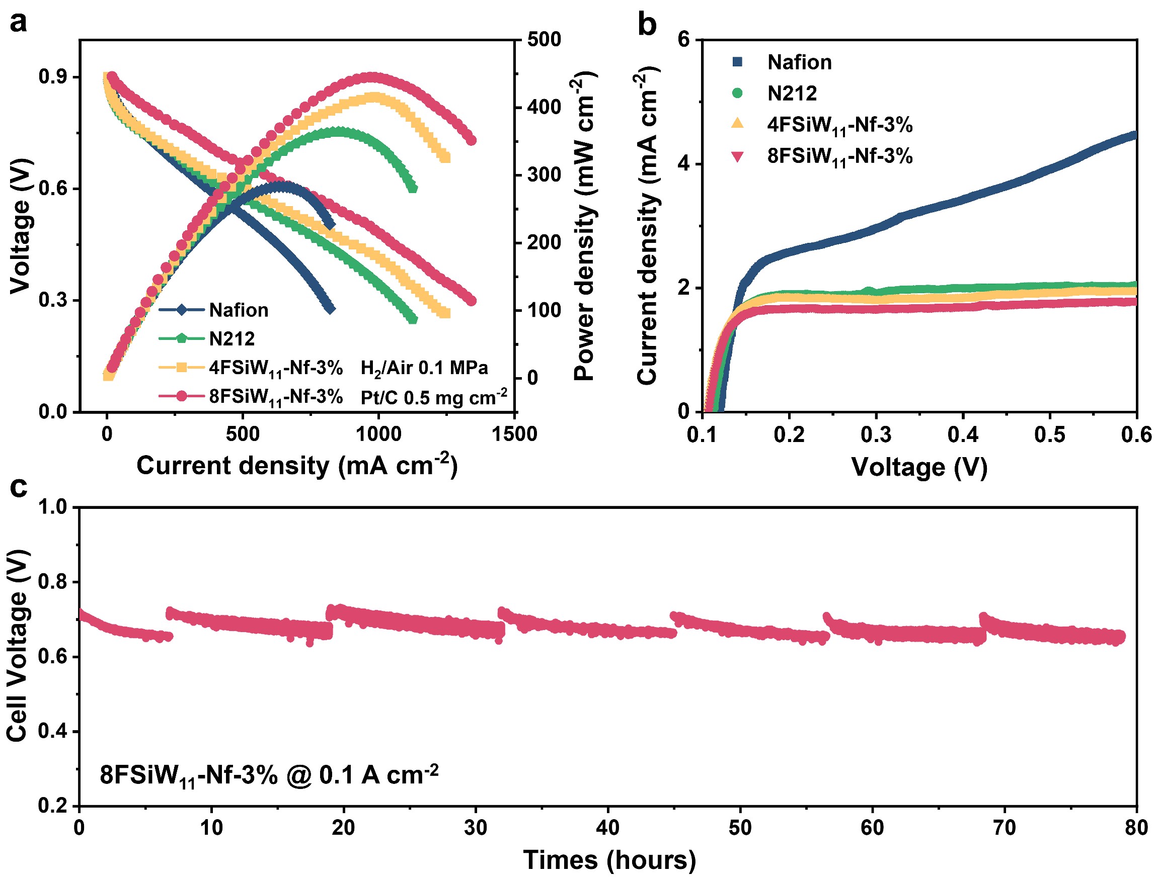 3.氢气/空气燃料电池功率密度最高可达445 mW cm-2,比纯Nafion膜提高57%,比商用N212膜提高了29%;