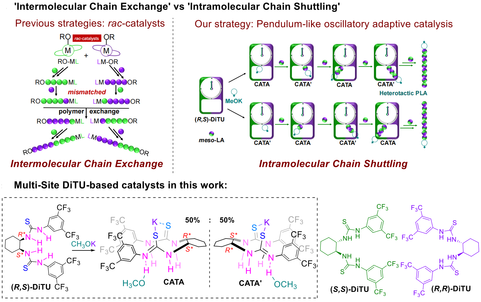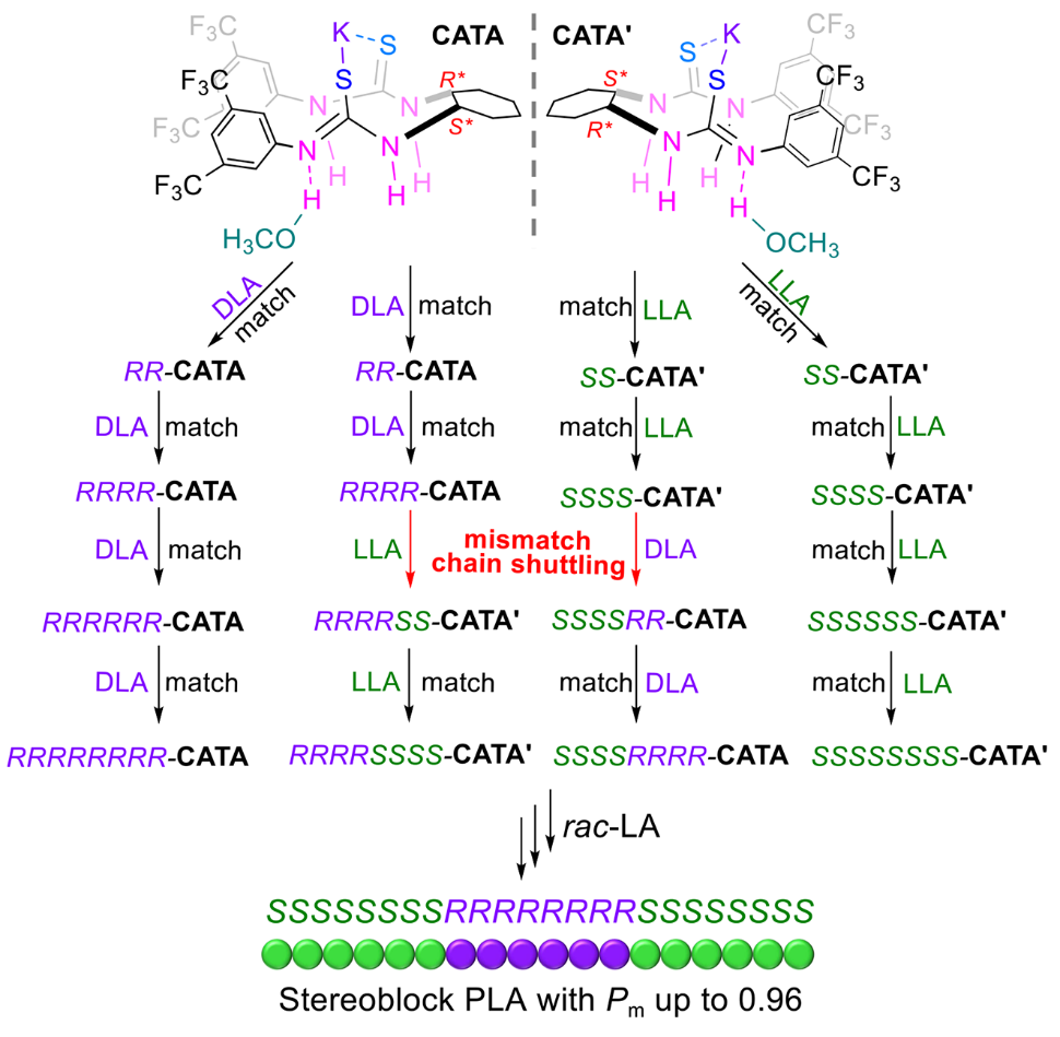 张越涛教授课题组合成了基于顺式环己二胺的双硫脲催化剂cis(R,S)-DiTU,与甲醇钾结合催化丙交酯的立体选择性聚合,双硫脲基团在钾桥的作用下相互靠近,可以在链末端手性识别和单体的立体选择性活性进行切换,实现了丙交酯的立体选择性聚合,合成了等规和杂同等规聚乳酸。