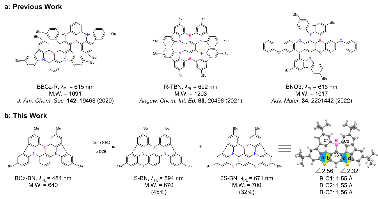 图1:代表性橙红色/深红色MR分子。a典型的橙红色/深红色MR分子具有对位B-π-B结构。b S-BN和2S-BN的合成方法和分子结构。右:2S-BN的晶体结构。