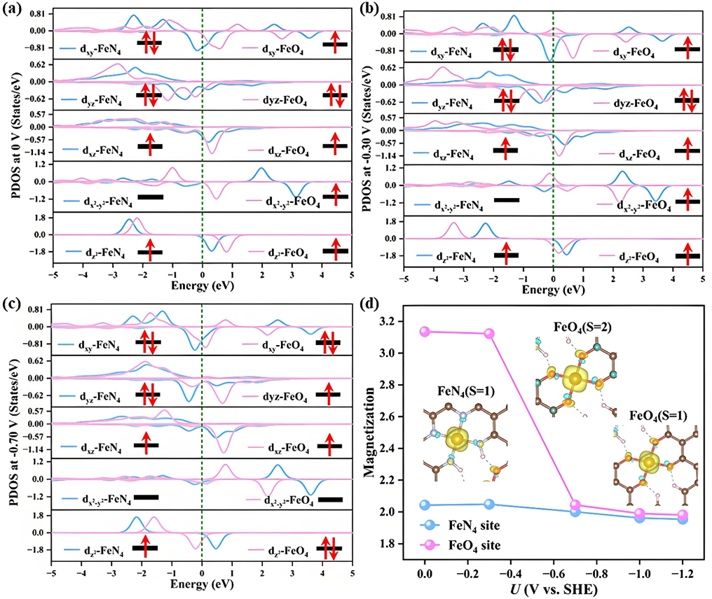 图3.不同电位下活性位点自旋态和磁矩的演变情况。