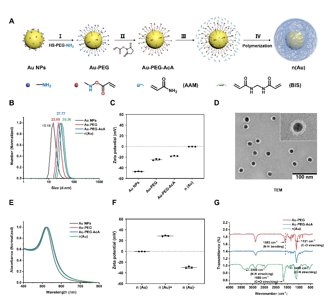 目前,Au NPs的常用表面配体包括聚乙二醇(PEG)、聚六亚甲基双胍(PHMB)、聚丙烯酸(PAA)和聚苯乙烯(PS)等,但现有聚合物配体多采用静电吸附法或接枝法,形成柔软且疏松的表面,生物体内长期稳定性和功能性仍待提升,这凸显了表面工程与制备技术持续创新的必要性。本研究采用原位自由基聚合的修饰策略,选取丙烯酰胺(AAM)为单体、N,N'-亚甲基双丙烯酰胺(BIS)为交联剂,在AuNPs表面修饰一层交联聚合物壳层,得到高稳定性的AuNPs(n(Au))(图1)。n(Au)增加的水力学半径、近乎中性的表面电势、透射电镜图像以及红外表征均证实了n(Au)的成功制备,并呈现出单分散的核壳结构,其壳层厚度约为5nm。