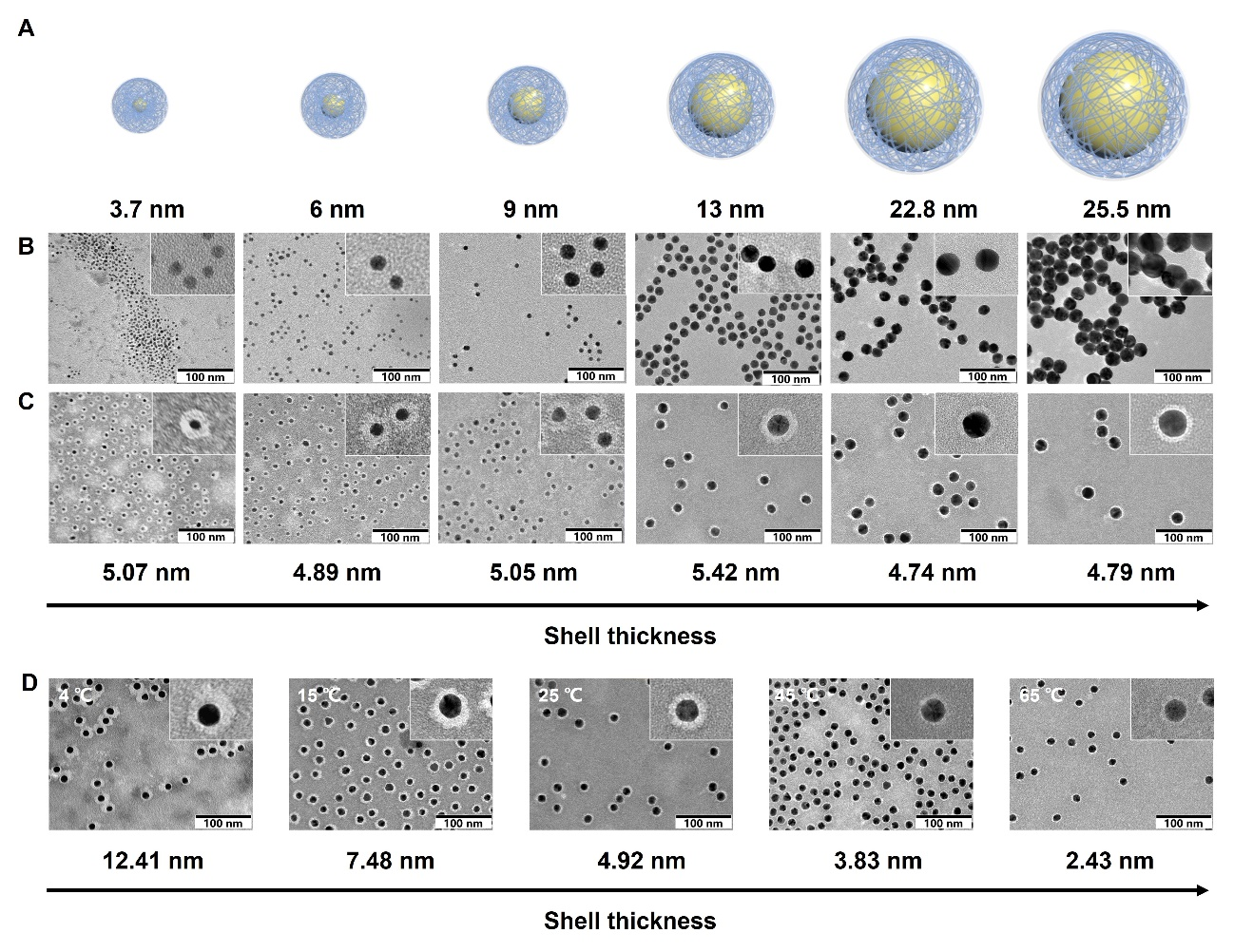 图2.金纳米粒子表面聚合物壳层厚度调控