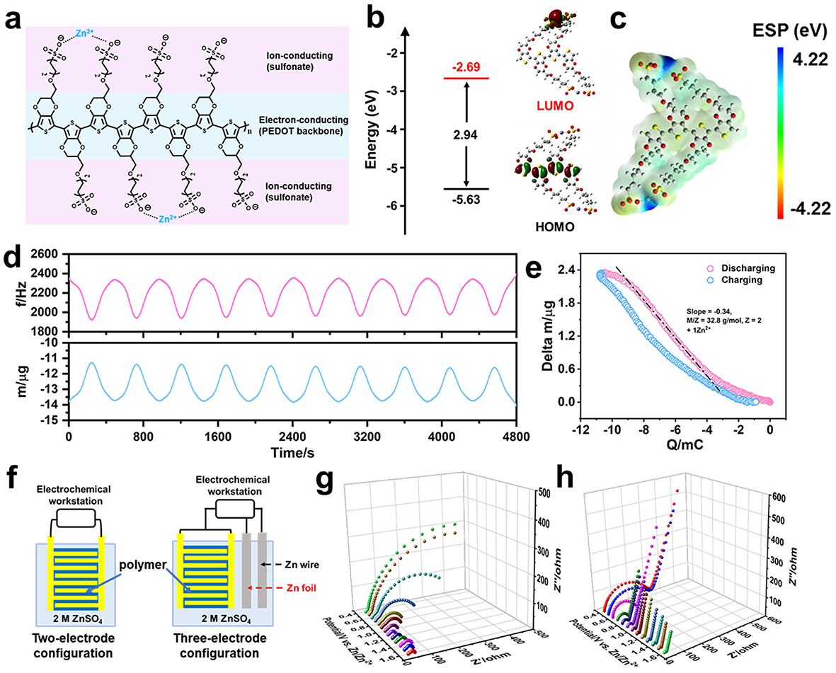 晁单明教授联合吉林师范大学冯明教授,中科院长春应化所王颖教授团队,提出一种集成式的有机混合电子/离子导体(OMEIC),通过空间耦合电荷传输路径,实现电荷(Zn2+/e-)的重新分配和快速传输。通过原位石英晶体微天平技术揭示了OMEIC的自掺杂行为和锌离子配位/解离的独特电荷存储机制。并通过原位电化学阻抗技术研究了OMEIC的电子/离子电导率随实时电位的变化,证明了其在时间尺度上固有的优异导电特性。通过钒氧化物的层间限域作用,在纳米尺度上构建双导电路径,进而提高电荷密度并加速离子扩散,产生更多的活性位点并加速反应动力学,从而增强正极的实际电化学性能。