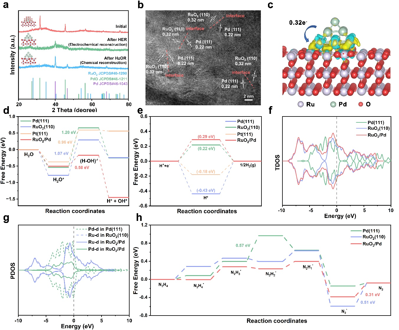 针对上述问题,卢晓峰教授研究团队提出了一种原位电化学/化学重构策略,实现了RuPdOx中空纳米纤维在HER和HzOR中分别自发产生RuO2/Pd异质结构。密度泛函理论(DFT)计算证实了界面处Pd到RuO2的有效电子转移,调控了RuO2/Pd异质结构中Pd和Ru的d带中心位置,优化了局部电子环境和中间体的吸附与解吸,显著降低了HER过程中的水解离能垒和HzOR过程中的决速步能垒,大幅提升了催化性能。重构后的催化剂在工业级电流密度下展现了明显优于商业Pt/C催化剂的HER和HzOR性能。此外,重构后的催化剂在1A cm–2电流密度下稳定运行500小时,远优于目前报道的HzOR催化剂。值得注意的是,以RuPdOx中空纳米纤维催化剂为电极,构建的双电极全肼水解池(OHzS)的产氢能耗显著低于整体电解水系统,表现出高效产氢性能。