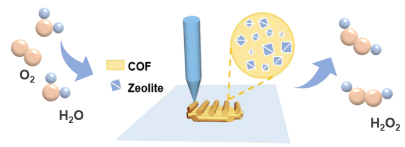 图1. 3D打印共价有机框架/分子筛复合材料用于光催化生产过氧化氢示意图