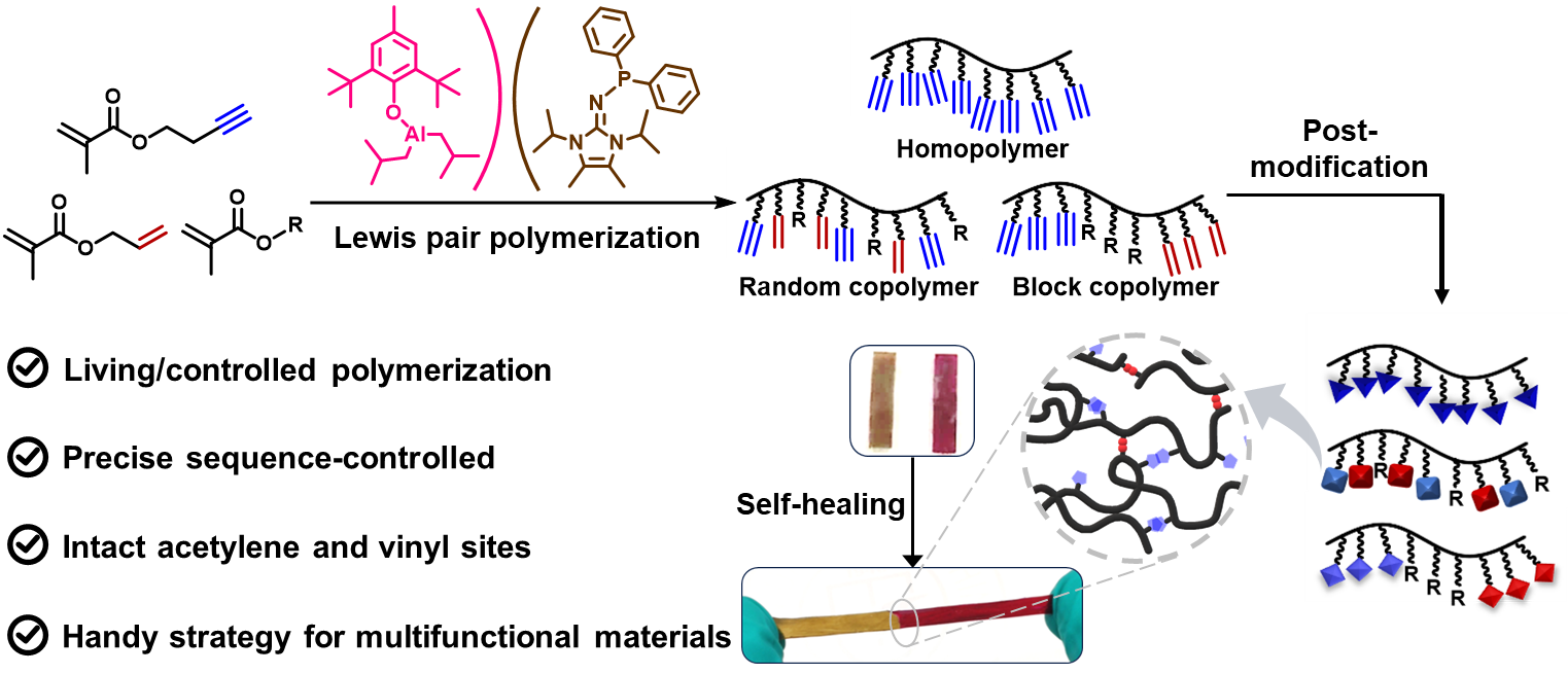 在高分子材料领域,对含有烯基和炔基的聚合物进行后修饰是合成各类功能高分子材料的通用转化平台。这两种官能团可分别通过高效的点击反应(如一价铜催化的叠氮-炔烃环加成反应(CuAAC)、硫醇-烯烃(Thiol-ene)点击反应)进行后修饰,为制备多功能聚合物材料(如生物医用材料、智能响应材料等)提供了无限可能。然而,通过现有的活性聚合体系合成含悬垂炔基和烯基位点的聚合物通常需要严格控制反应条件或进行繁琐的保护-去保护过程。因此,开发一种能够在温和条件和简便操作下,同时高选择性地保留炔基和烯基,并实现分子量可控、序列可控的聚合方法,成为制备高性能多功能聚合物材料的核心需求。