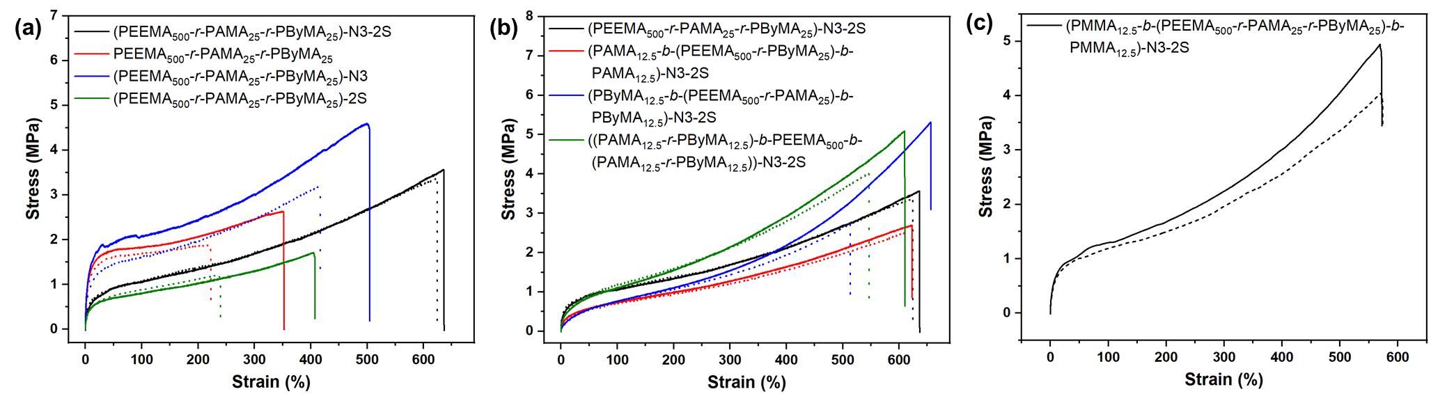 图4.不同结构聚合物修复前后的力学性能(实线:修复前;虚线:修复后)