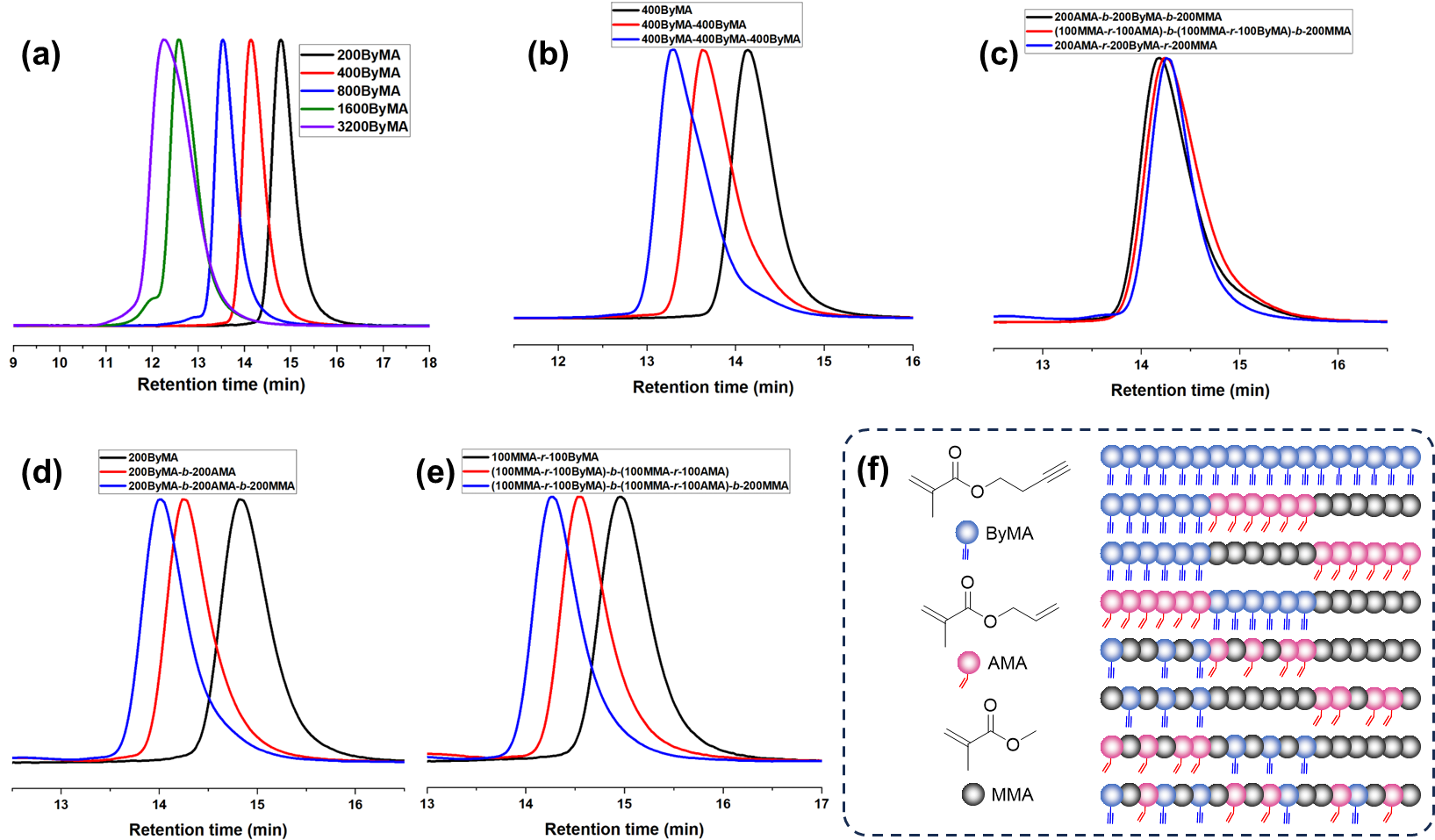 图2. (a)不同单体与催化剂比例所得PByMA的GPC曲线迭加图;(b)链延伸实验GPC曲线迭加图;(c-e)嵌段共聚实验GPC曲线迭加图;(f)能够合成的不同序列结构的共聚物示意图