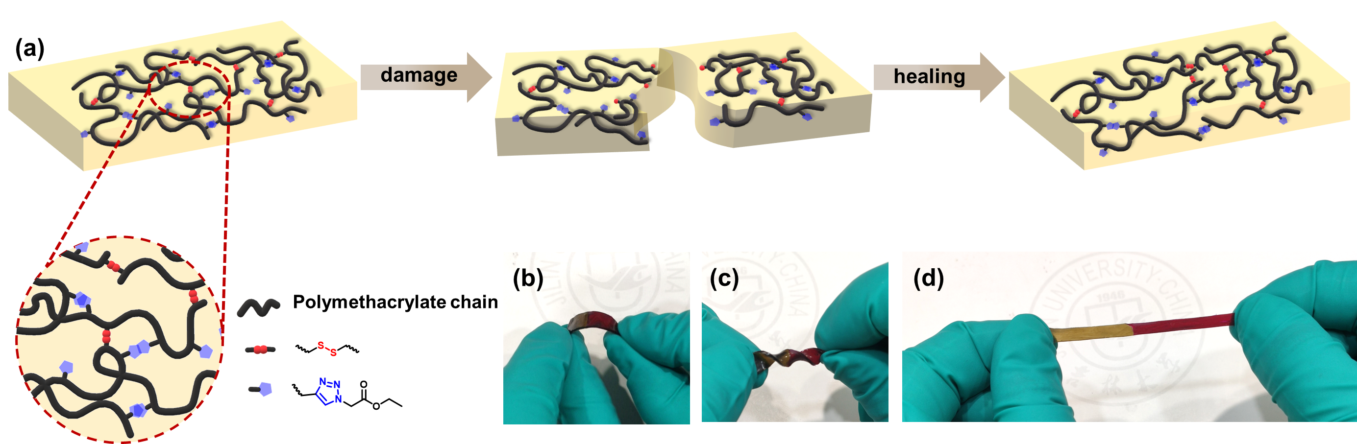 图3. (a)自修复过程示意图。(PEEMA500-r-PAMA25-r-PByMA25)-N3-2S在50°C,5h修复后的(b)弯曲、(c)扭转和(d)拉伸的照片(样条红色部分中添加罗丹明B作为染料)