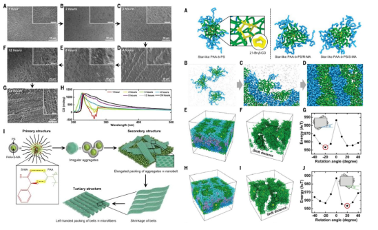 团队通过介观尺度分子模拟揭示了非手性两亲性单分子胶束与手性添加剂的协同组装机制、多级次手性超结构形成动力学过程以及手性反转亚稳态的结构起源。该研究为设计具有超高手性光学活性的智能材料提供了理论指导,对理解超分子手性自组装行为有重要意义。哔咔漫画