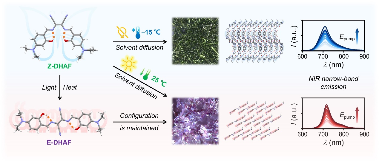 张红雨教授团队与纽约大学Panče Naumov教授团队联合开展了研究,提出了一种基于异构化与晶体生长动力学协同调控的新策略。通过操纵二氨基马来腈衍生物的顺/反(Z/E)异构过程及结晶条件,实现了超窄带近红外发射晶体(715 nm)的可控制备。所获Z型晶体具有尺寸依赖的发射窄化效应,半峰宽可降至约40 nm (0.096 eV);E型晶体兼具超窄发射与高光稳定性,在长时间激光照射下仍保持性能稳定。团队从分子间相互作用和激子-振动耦合角度揭示了其物理化学机制。该研究为发展高性能有机近红外发光材料提供了新方法,并在光通信、生物成像和柔性光电器件等领域展现出应用潜力。