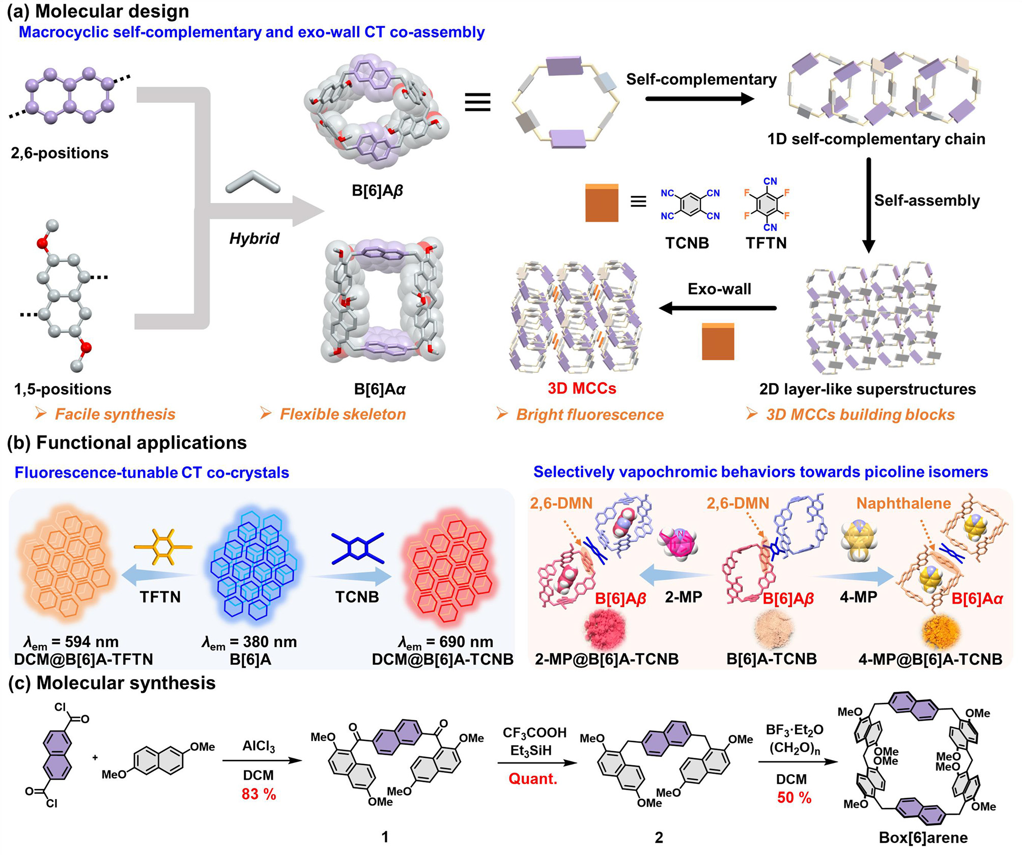 杨英威教授课题组成功设计合成了一种新型柔性大环芳烃——Box[6]arene(B[6]A),并利用其独特的自互补性和外壁电荷转移相互作用,构筑了具有可调控荧光和对甲基吡啶异构体选择性汽致变色行为的三维CT共晶材料(图1)。该研究扩展了大环芳烃的结构类型,同时建立了一种基于分层自组装的三维CT共晶构筑策略,为设计智能响应材料开辟了新途径。研究成果以“Design and Synthesis of Box[6]arenes for 3D Charge-Transfer Co-Crystal Engineering via Macrocyclic Self-Complementary and Exo-Wall Interactions”为题发表在《Angewandte Chemie International Edition》(DOI: 10.1002/anie.202513299)期刊上。
