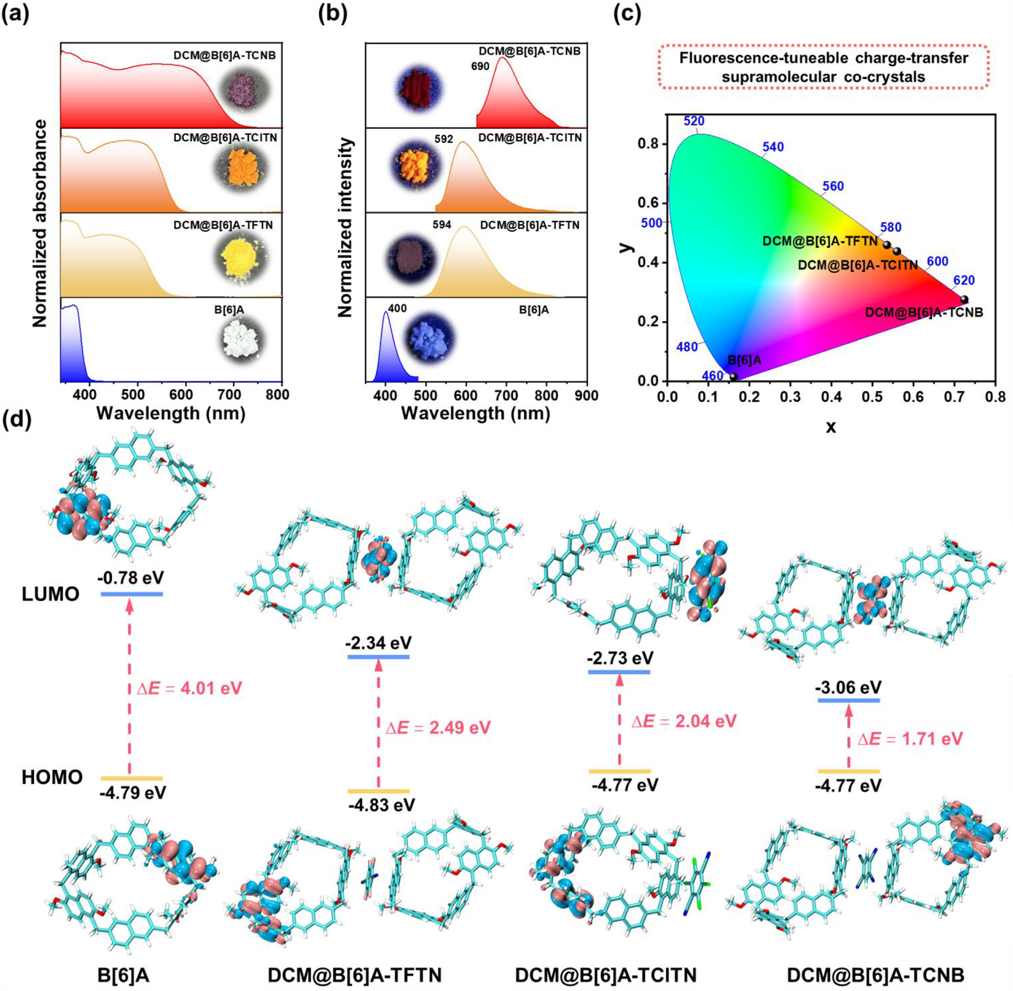 为了评估共晶结构特征对其光物理性质的影响,作者研究了三种CT共晶的光物理性质(图3)。结果表明,三种共晶均呈现出可调的荧光发射性质,其荧光发射波长相较于B[6]A(400 nm)发生不同程度的红移,实现了从蓝色到红色的荧光调控。作者还通过理论计算(DFT)证明了该红移现象源于共晶带隙的逐渐减小。
