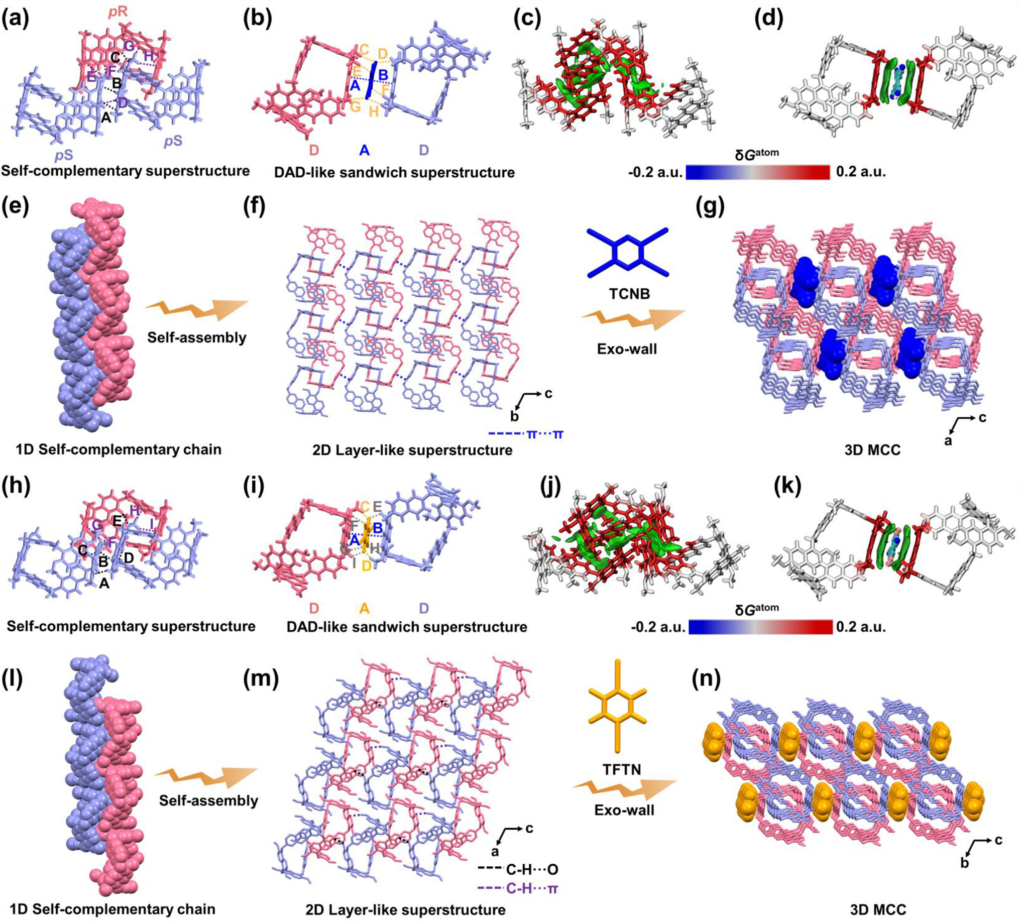 晶体结构分析表明,B[6]A在固态下具有两种不同构象——规则的正六边形盒型构象(B[6]Aα)和拉长的不规则六边形构象(B[6]Aβ),两者均可自组装形成一维分子管超结构。鉴于B[6]A为富电子柔性大环芳烃,且其在溶液态下与缺电子客体具有强CT相互作用,作者研究了CT复合物固态下的超结构特征(图2)。DCM@B[6]A-TCNB和DCM@B[6]A-TFTN的晶体结构分析表明,B[6]A首先通过大环自互补自组装形成一维链,随后通过π···π、C-H···O和C-H···π等弱相互作用自组装为二维平面超结构。最终,TCNB及TFTN通过外壁CT作用及多重弱相互作用连接相邻两层,形成紧密堆积的三维大环基CT共晶。此外,还通过基于Hirshfeld分区的独立梯度模型对存在的弱相互作用力进行了可视化表征,进一步揭示了该类材料的稳定构筑机制。