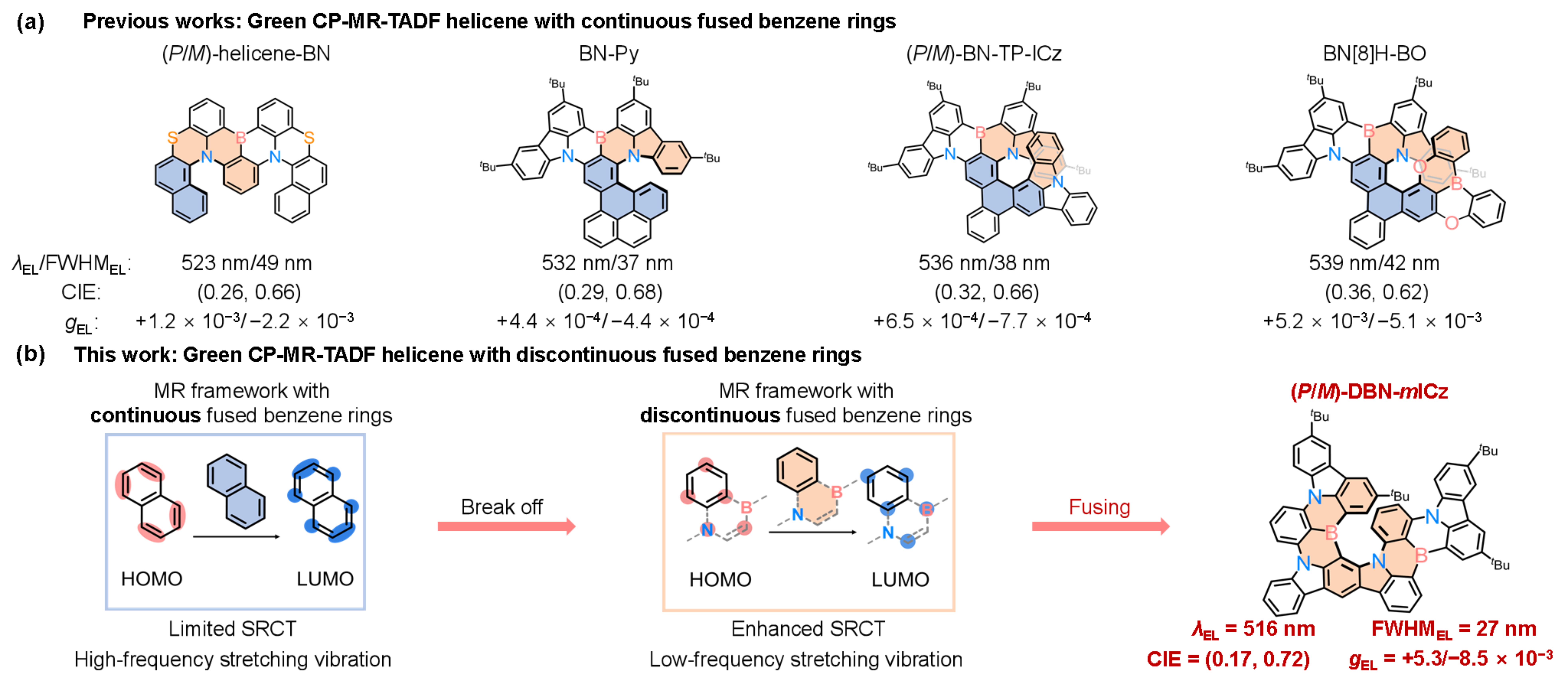 图1.(a)此前报道连续稠合苯环构筑CP-MR-TADF绿光分子及其性能表现.(b)非连续稠合苯环构筑CP-MR-TADF绿光分子设计思路及分子性能表现。