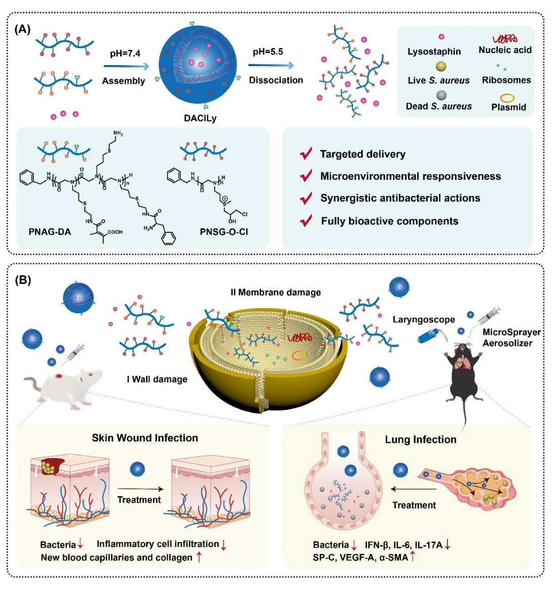 陈学思院士和孙静教授研究团队设计了一种简洁、高效的策略,通过集成多种协同抗菌组分,成功开发出一种新型智能纳米囊泡抗菌平台-DAClLy,有效借助组分间的协同增强效应,不仅在细菌感染部位实现精准富集与智能释药,更通过多重机制协同抗菌,高效清除耐药菌和生物膜,大幅提升杀菌效率。这一策略有效克服了传统单机制给药的局限性,其简洁高效的设计,为临床耐药菌感染治疗提供了新的治疗解决方案,也为应对全球健康威胁提供了一条具有转化前景的可行路径。