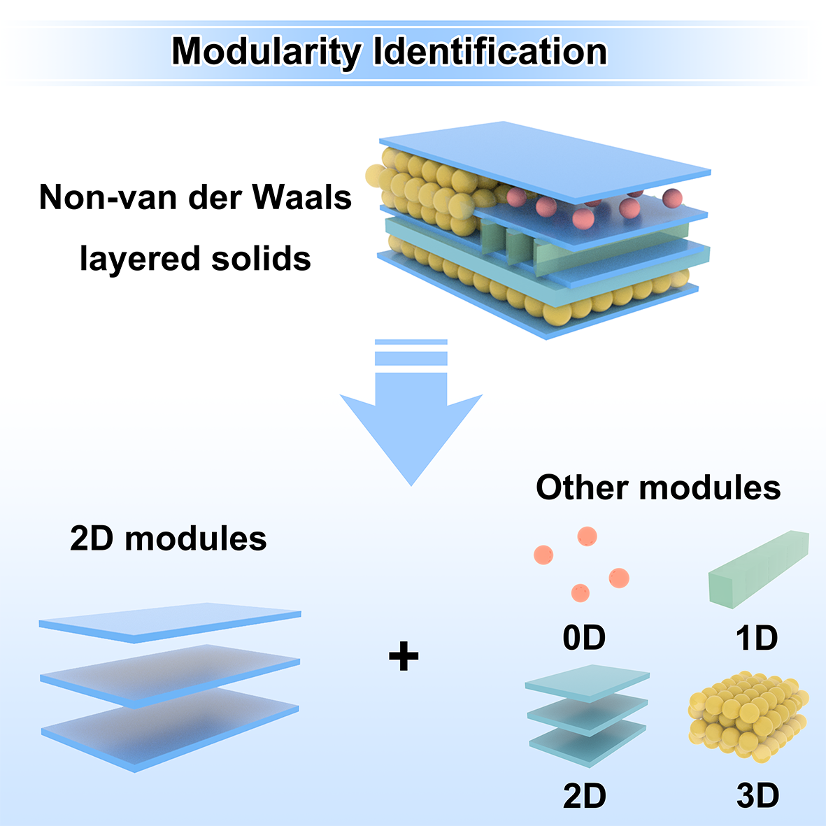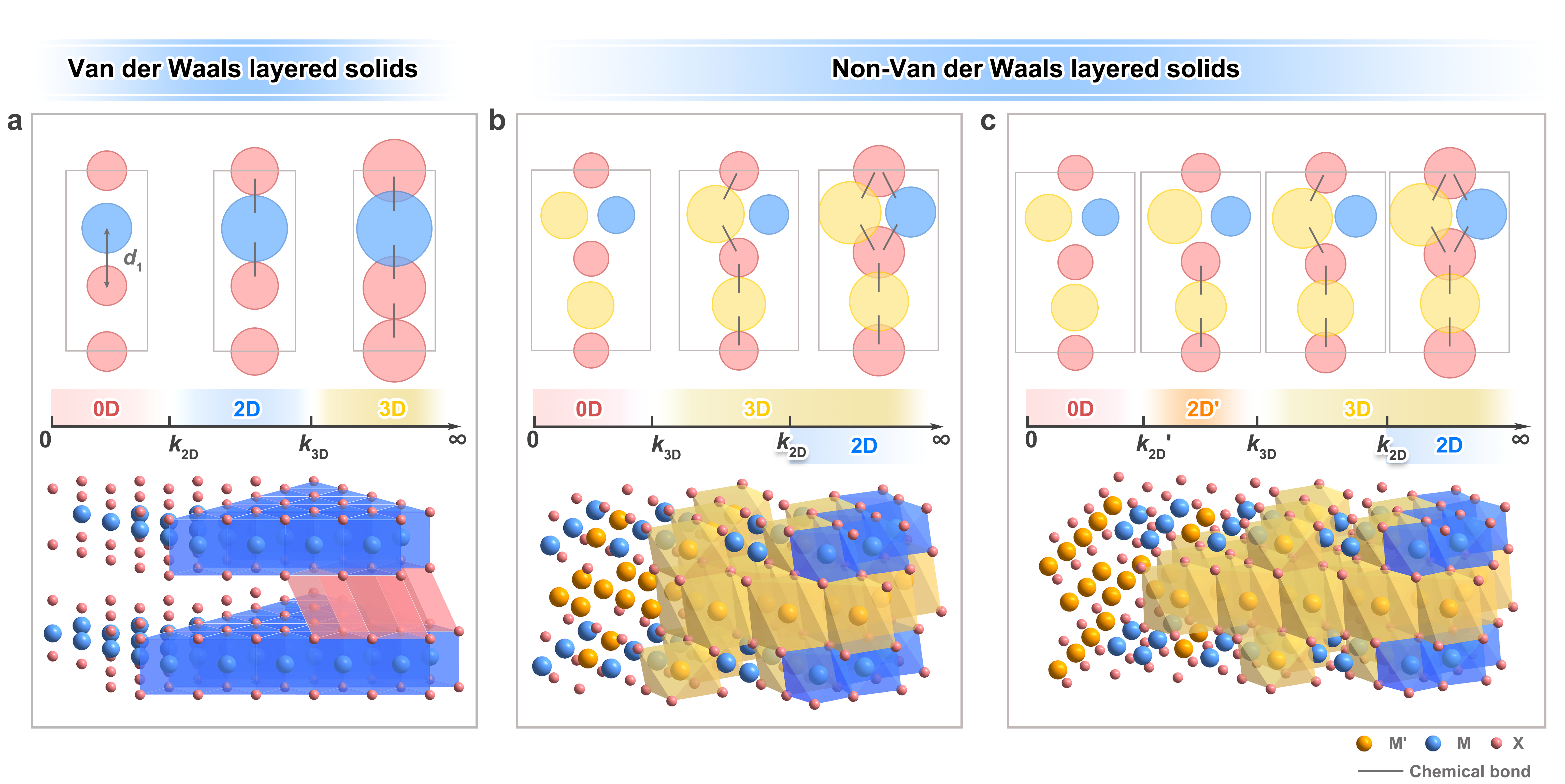 二维材料因其独特的原子级薄层结构,在能源、电子和催化等领域展现出重要应用前景。当前的自动识别与筛选算法主要聚焦于原子排布较为松散的范德华层状晶体,如石墨和过渡金属硫化物。相比之下,非范德华层状晶体中往往存在共价、离子或金属键主导的层间连接,原子间距更近、层间耦合更强,导致传统的算法难以适用(图1)。这一识别盲区导致非范德华层状材料难以被批量挖掘,严重限制了此类材料在二维材料领域的拓展和利用。
