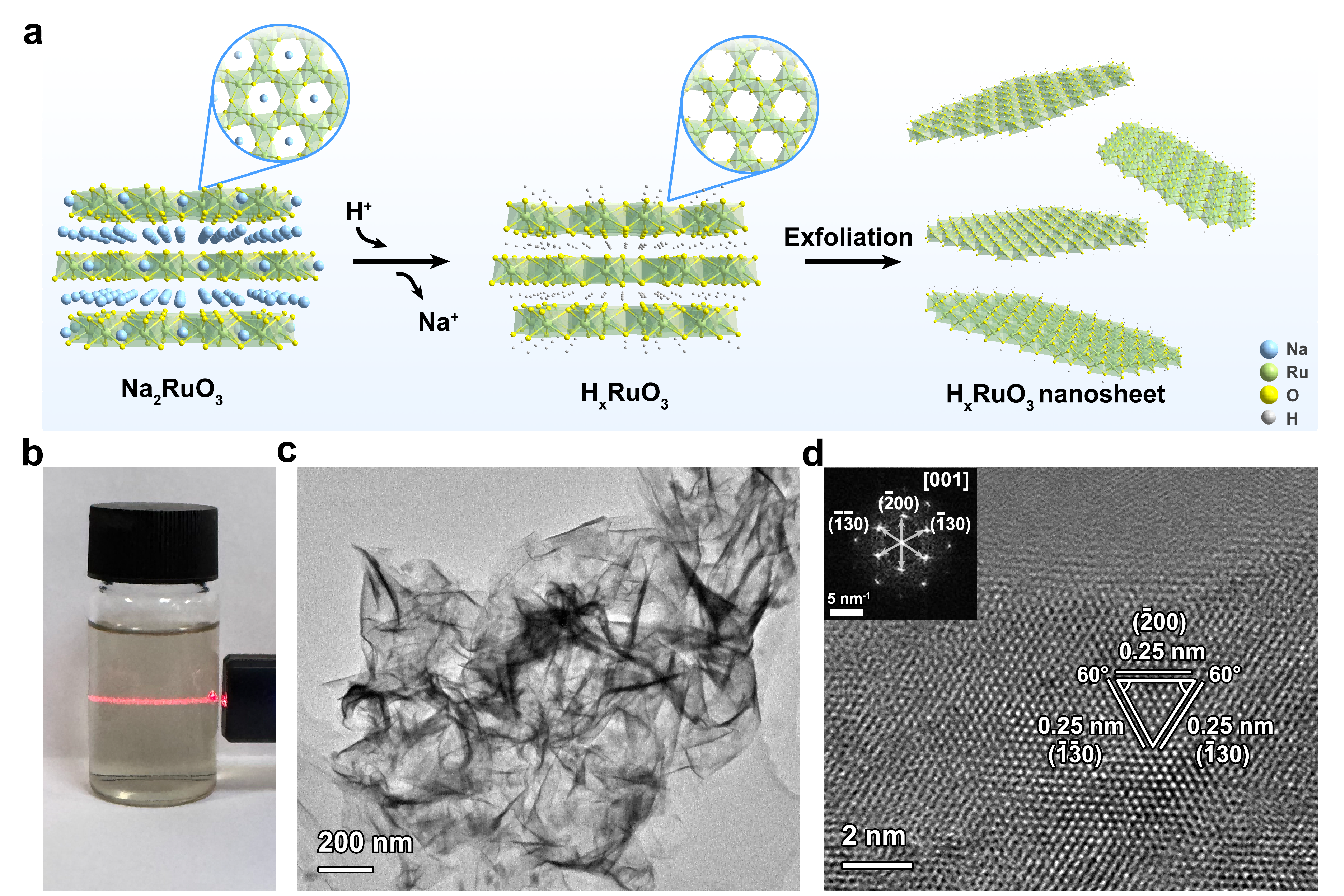 实验方面,团队首次实现了非范德华晶体Na2RuO3的原位质子交换剥离(图3),成功制备出超薄HxRuO3纳米片,证实了“结构模块化识别”策略的可行性。该研究不仅显著拓展了二维材料的化学空间,也为非范德华晶体中二维材料的结构识别提供了新范式,对该领域具有重要价值。