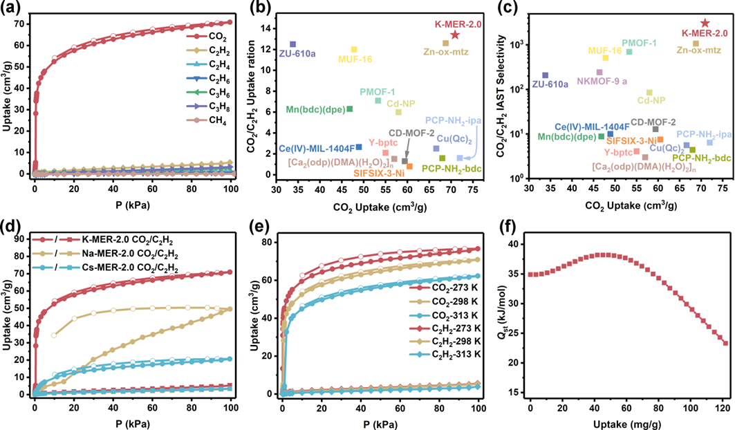 宋晓伟教授和梁志强教授课题组联合天津工业大学梅东海教授,报道了一种无需有机模板合成的柔性沸石材料K-MER-2.0(硅铝比为2.0),其在298 K和101 kPa条件下具有显著的70.9 cm3/g的CO2静态吸附容量,优于其对烃类的吸附容量(C2H2: 5.3cm3/g, C2H4: 1.3 cm3/g, C2H6: 0.6 cm3/g, C3H6: 2.7 cm3/g, C3H8:3.3 cm3/g, CH4: 0.04 cm3/g),从而展现出卓越的CO2/烃类分离性能。该材料在CO2/C2H2(体积比50/50)混合物中的理想吸附溶液理论(IAST)选择性达到了3056。值得注意的是,K-MER-2.0在穿透实验中能够一次性纯化乙炔,且纯乙炔(99.6%)产量高达1872 mmol/kg,从而无需多阶段解吸过程,并且为CO2/C2H2反分离吸附剂提供了新的基准。