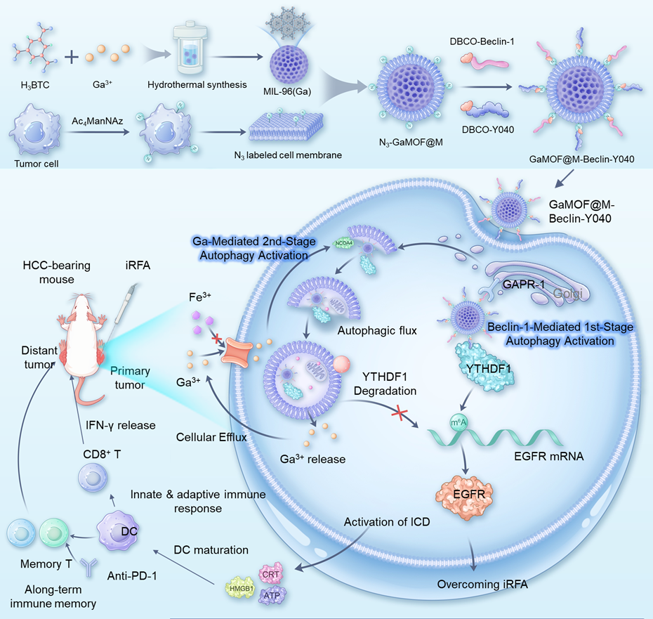 针对这一难题,闫飞教授团队成功构建了一种基于镓金属有机框架(Ga-MOF)的“双阶段累积激活”自噬降解系统——GaMOF@M-Beclin-Y040。该系统以肝癌细胞膜进行仿生修饰,并通过代谢糖基工程与点击化学技术,将YTHDF1特异性小分子抑制剂Y040与自噬激活肽Beclin-1精准组装于材料表面。
