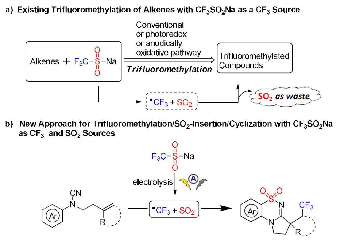 三氟甲基取代的有机氟化合物在医药、农药、材料等领域具有广泛应用。因此,发展高效、实用的合成方法制备三氟甲基取代的有机化合物具有重要的研究价值。Langlois试剂(CF3SO2Na)是一种稳定、廉价的自由基三氟甲基化试剂,早在上世纪九十年代就被发现,但直到近几年才被广泛用于烯烃、芳烃等的三氟甲基化反应。在氧化条件下,该试剂通常发生单电子转移致使C-S键断裂生成CF3自由基和SO2。因此在有机合成中,可作为CF3自由基的给体实现多样化的三氟甲基化转化。然而,目前该类试剂仅作为三氟甲基给体,反应伴随释放的SO2作为反应废弃物,并实现有效利用。尽管近年来关于SO2替代物参与的磺化反应的研究已取得了长足发展(Asian J. Org. Chem.2015,4, 602;Chem. Commun.2018,54, 10405.),但是,基于Langlois试剂作为三氟甲基及二氧化硫给体的环境友好的绿色合成转化的研究仍未有报道。近日,寮渭巍教授课题组通过电化学方式,首次实现了Langlois试剂作为三氟甲基及二氧化硫给体与N-芳基氰胺反应,通过电化学氧化产生自由基的方式将三氟甲基化/SO2插入/环化有机的结合起来,通过串联环化的方式同时构建了两个C-C键、一个N-S键及一个S-C键,高效、原子经济性的合成了具有潜在合成应用价值和生物活性的氟代磺内酰亚胺衍生物。值得一提的是,该合成方法也同样适用于CF2HSO2Na参与的二氟甲基化/SO2插入/环化转化。