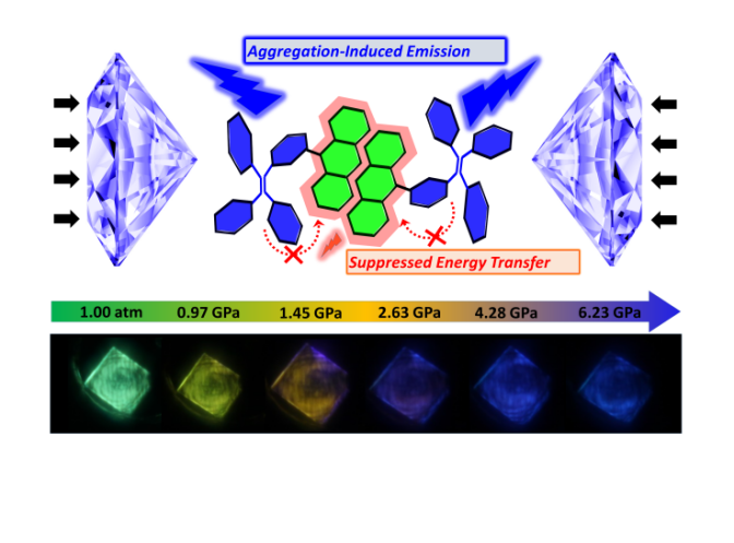 对于有机π-共轭分子材料,在固体堆积中强π-π作用通常会导致发光红移和猝灭。特别是在高压条件下,由于分子间π-π作用增强(π-π距离减小),压力诱导的发光红移和逐渐猝灭现象已经被普遍地观察。为了弄清超分子体系中相互作用与发光性质的关系,杨兵课题组巧妙设计并构筑了最小、最简单的超分子聚集体:离散的分子间π-π堆积二聚体,作为研究超分子发光材料结构与性质关系的理想模型。利用具有聚集诱导发光性质的基团对蒽进行单侧间位取代,构筑了离散型蒽π-π二聚体堆积的超分子晶体。与超硬材料国家重点实验室邹勃课题组合作进行高压实验,该有机晶体表现出压力诱导发光蓝移且增强的罕见现象。