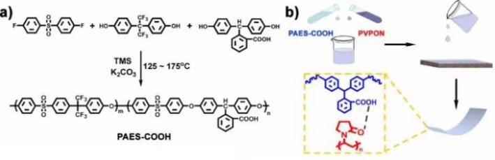 作者制备了羧酸官能化的低分子量的聚芳醚砜(PAES-COOH,Mn≈7.2×104),并将其与少量的聚乙烯基吡咯烷酮(PVPON,Mn≈3.6×105)在DMF中进行复合,获得均匀透明的复合物溶液,溶剂挥发后就可以方便地制备大面积的PAES-COOH/PVPON复合物膜材料(图1,以下简称“复合材料”)。当PVPON的质量分数为10%时,所制备的复合材料的断裂强度和杨氏模量分别可达~104.8 MPa和~932.2 MPa,分别是PAES-COOH的~2.0倍和~1.7倍。复合材料的热分解温度为~506℃,具有优异的热稳定性,对水、乙醇、环己烷、石油醚、汽油等表现出优异的耐溶剂稳定性。透射电镜表明在复合材料中均匀分散有平均粒径约为33 nm的PAES-COOH/PVPON纳米粒子。一方面,PAES-COOH/PVPON纳米粒子由于内部的氢键交联而具有刚性,且纳米粒子与基体聚合物有强的氢键作用力及链段的物理缠结,因此此种纳米粒子作为纳米填料可以实现对复合材料的高效力学增强;另一方面,复合材料中存在大量高密度的氢键作用,两方面的共同作用,使材料获得了高力学强度。