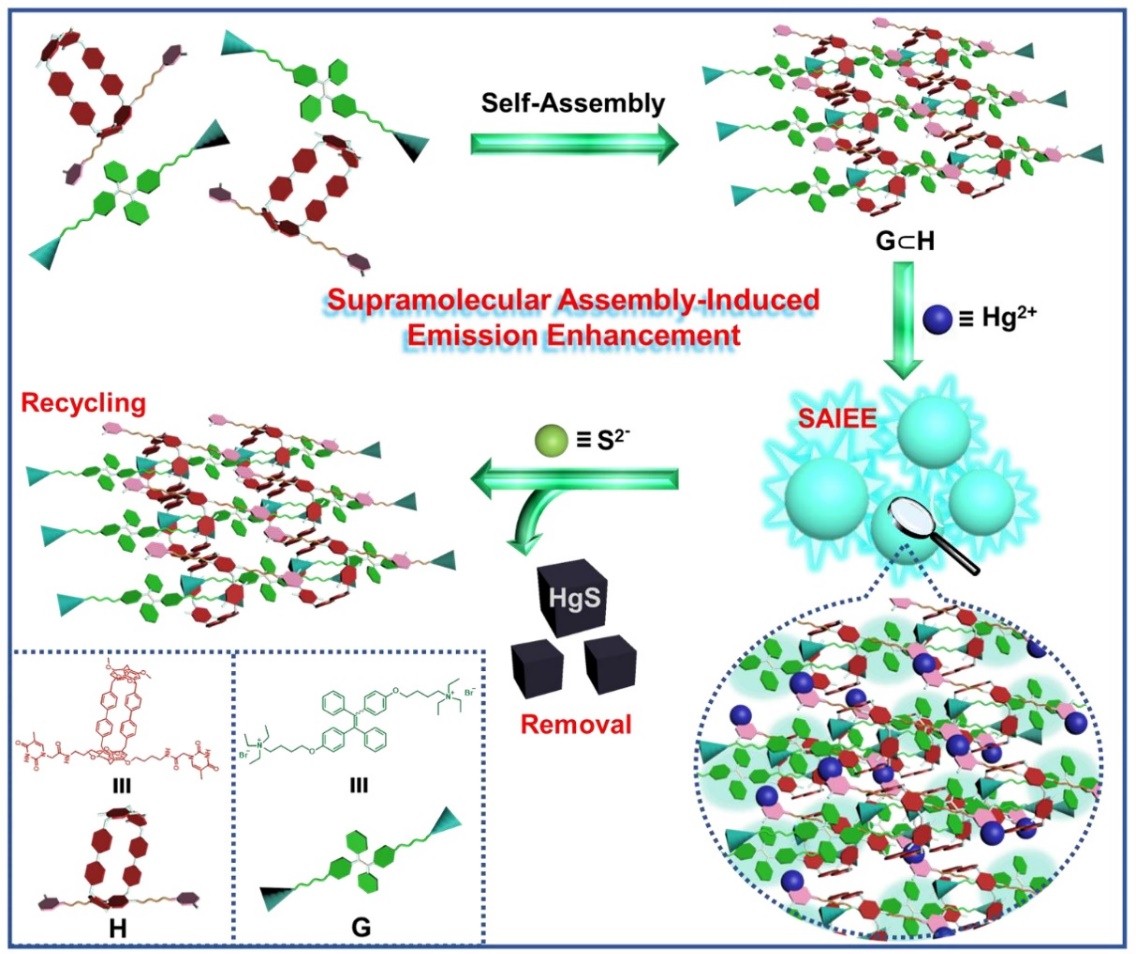 结合聚集诱导发光现象和大环合成受体的超分子组装,该课题组在前期工作积累中总结并提炼出了超分子组装诱导荧光发射增强(Supramolecular Assembly-Induced Emission Enhancement,SAIEE)的概念,为超分子功能体系在传感检测、药物递送、生物成像、自组装和智能发光材料等领域带来了新的可能性(Adv. Opt. Mater. 2018, 6, 1800668)。在最近发表的JACS工作中,该团队通过对联苯拓展型柱[6]芳烃进行双功能化的修饰,将胸腺嘧啶基团作为侧臂连接在大环主体上,进而将其与作为客体分子的四苯乙烯季铵盐衍生物进行主客体键合,所形成的主客体复合体系可通过胸腺嘧啶-汞离子-胸腺嘧啶的特定作用与汞离子高强度结合构筑出新型的三维超分子聚合物纳米粒子体系。该团队发现这种新型体系具有SAIEE的现象,并基于此开发出了该体系对水中污染物汞离子的高效检测和分离去除功能。同时,该团队还发现这种体系对汞离子的检测限低、去除效率高,且材料本身的可循环利用性强。这种新型的超分子聚合物材料不仅开拓了拓展型柱芳烃在环境污染物检测和分离中的应用,更延伸了SAIEE这一现象潜在的应用价值,为设计可应用于环境保护和能量存储的新型超分子发光材料提供了新的思路。