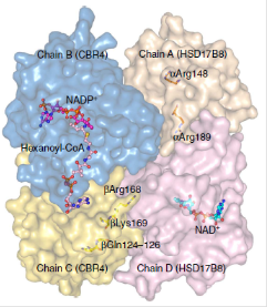 Recently published crystal structure of mitochondrial heterotetrameric ketoacyl reductase contributing to both fatty acid synthesis (chain A and D) and oxidation of unsaturated fatty acid (chains B and ) (Venkatesan et al, Nature Commun. 2014).