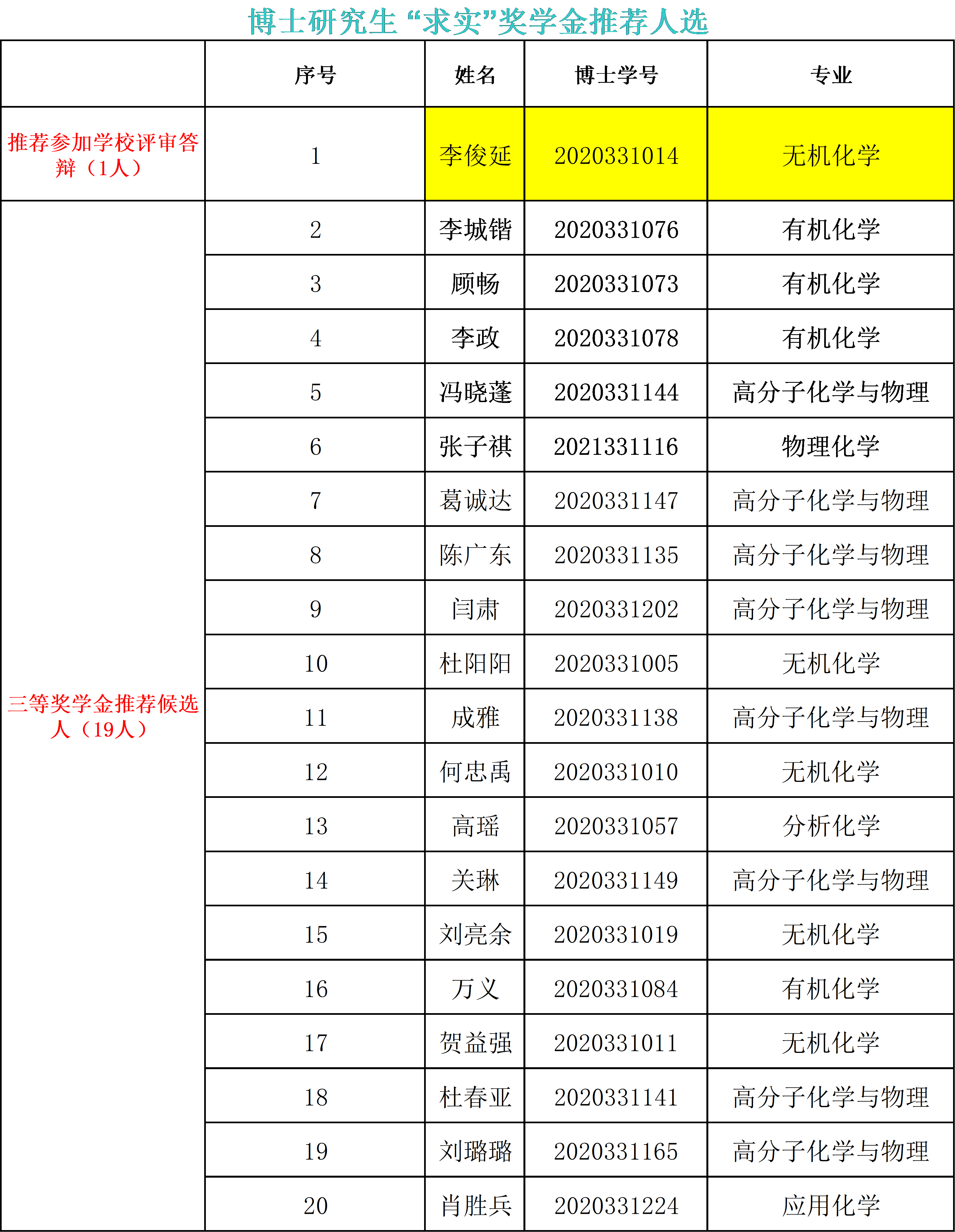 依据《哔咔漫画 博士生“求实”奖学金评选办法》要求,哔咔漫画 采取研究生个人申报、导师推荐、学院研办审核材料、评审工作小组初评推荐、哔咔漫画 研究生奖学金评审委员会审核确定的方式进行评定,现拟推荐1名博士李俊延(2020331014))参加学校评审答辩,竞争一等、二等“求实”奖学金;拟推荐李城锴等19名博士为 “求实”奖学金三等奖候选人(名单见附件),如有问题请联系赵晓杰老师,电话13504470223。